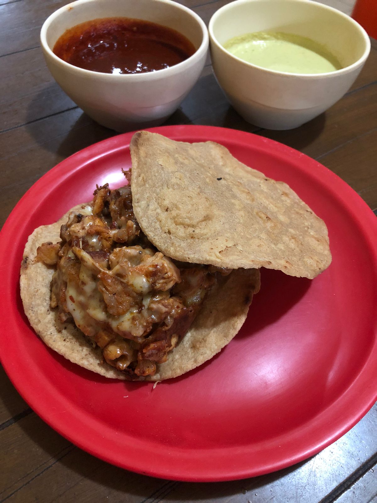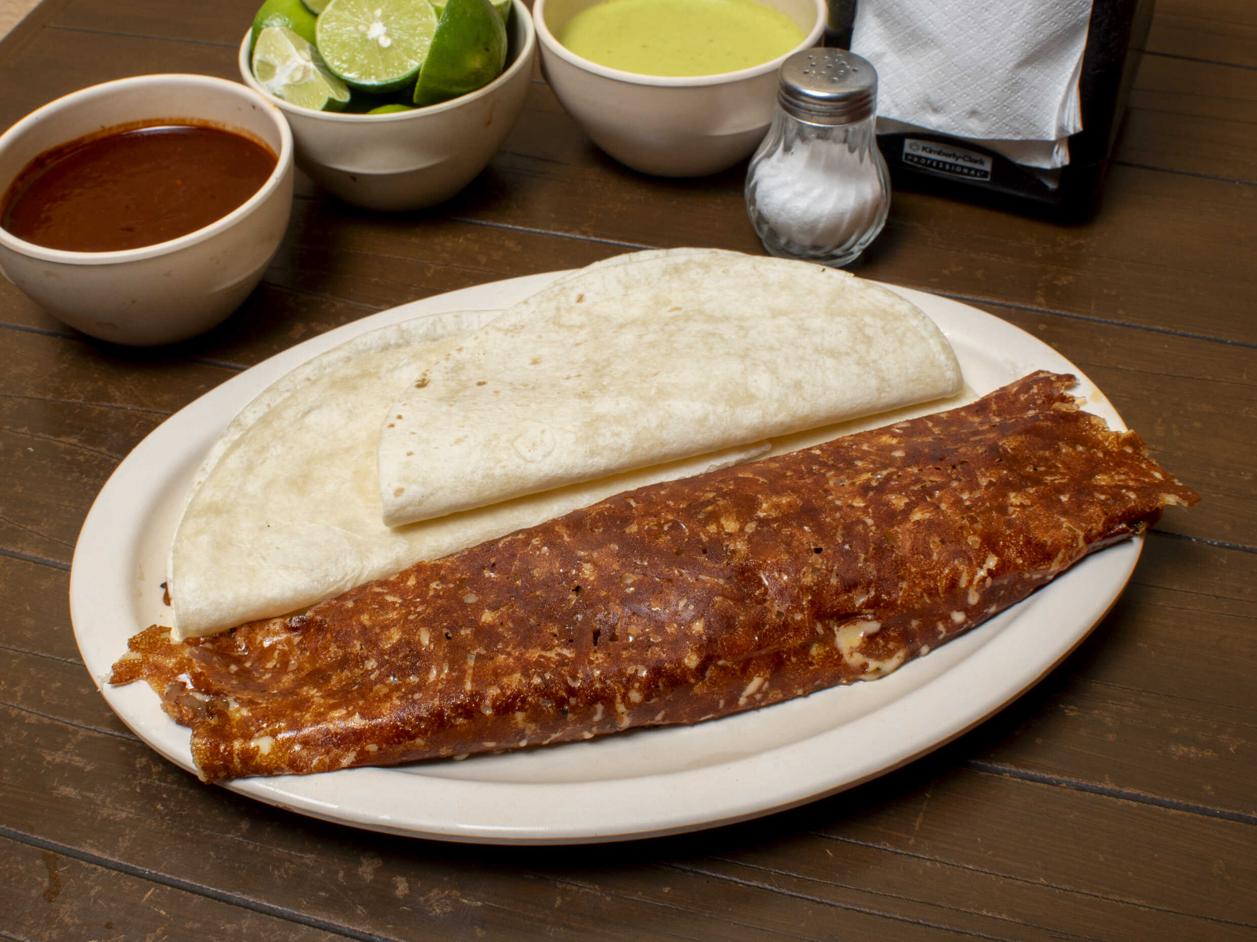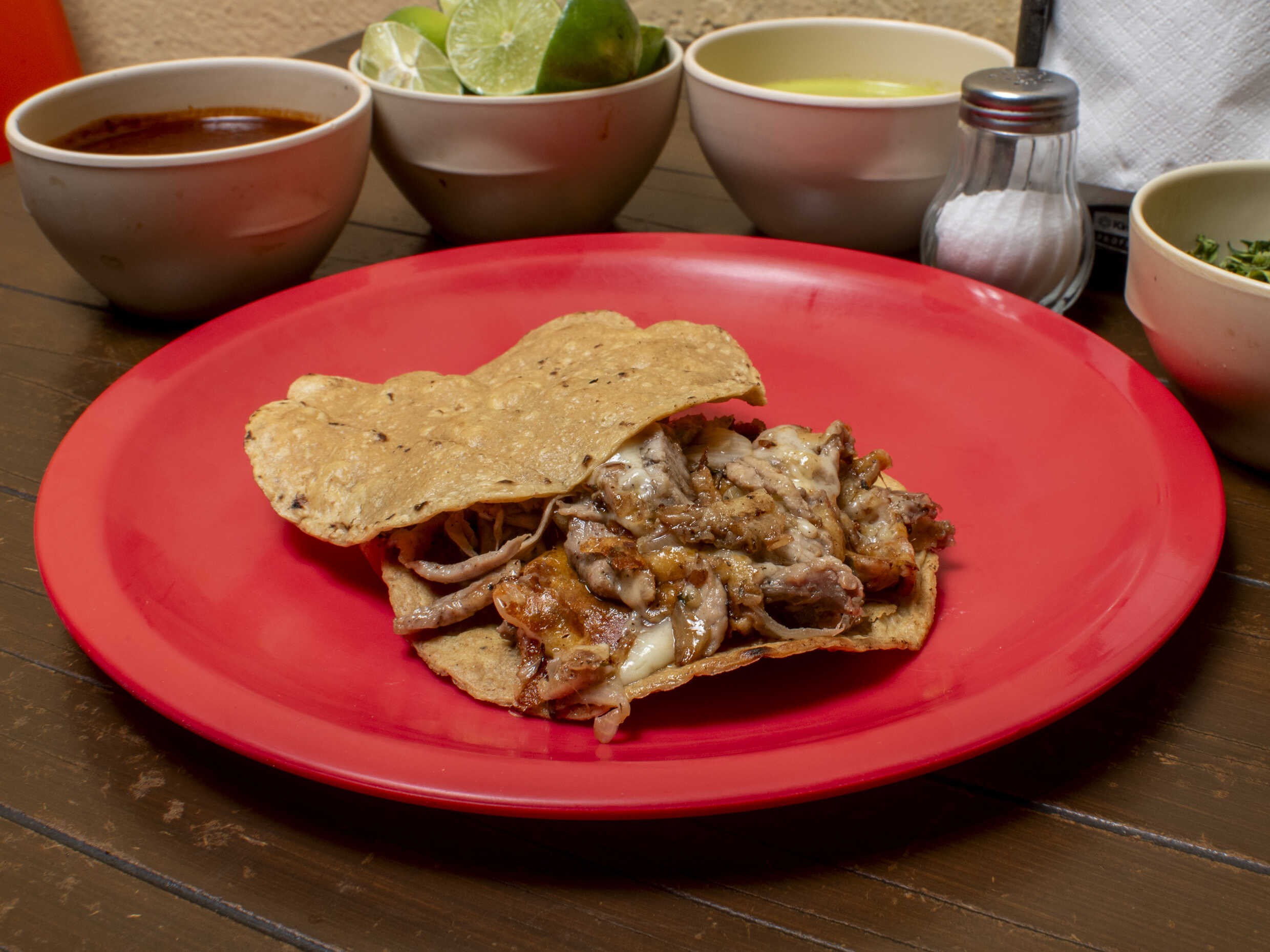 Rica costra de queso con carne a elegir con tortilla de harina o maíz.