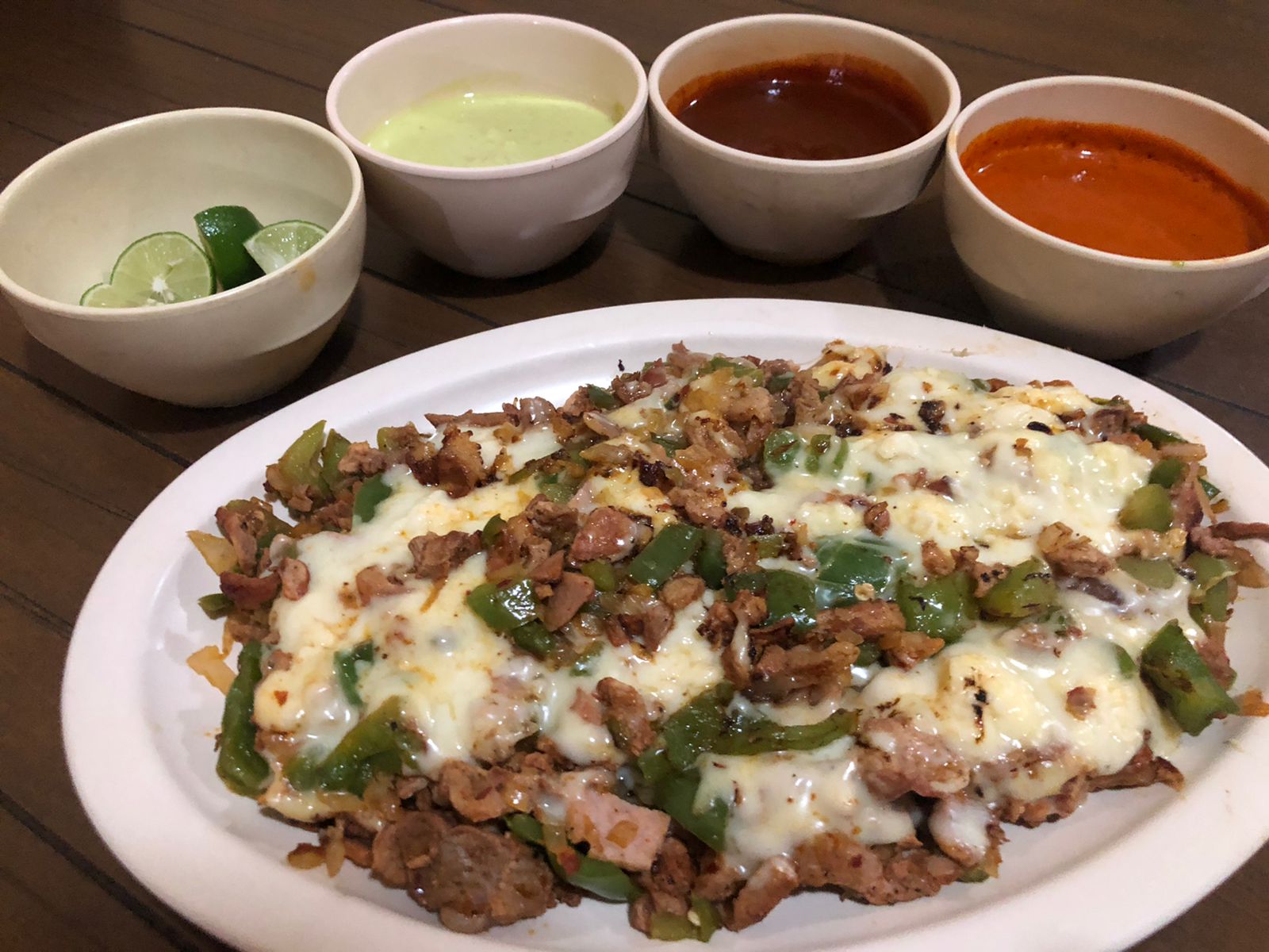 Rica combinación de cebolla, morrón, tocino, arrachera y queso.