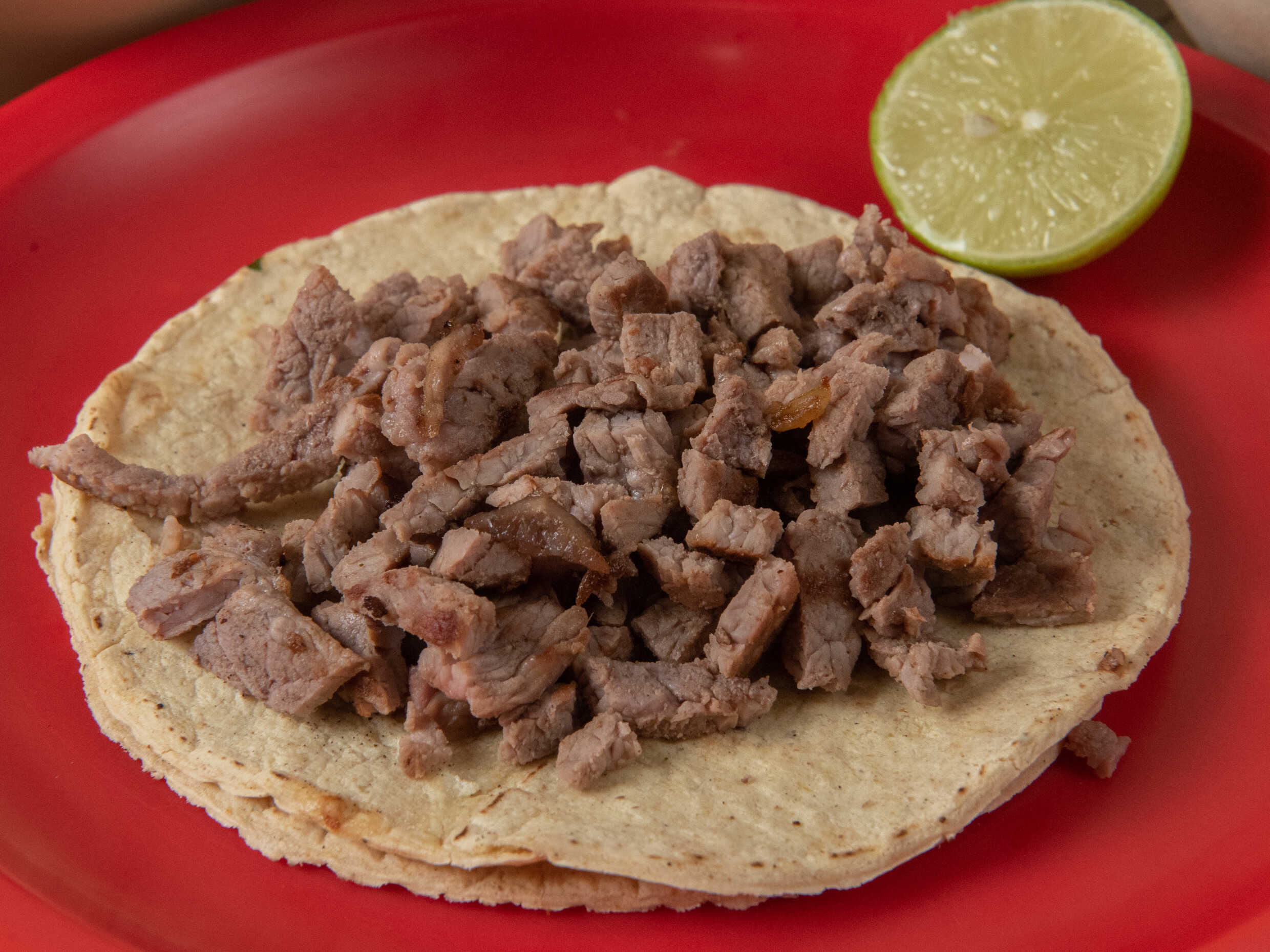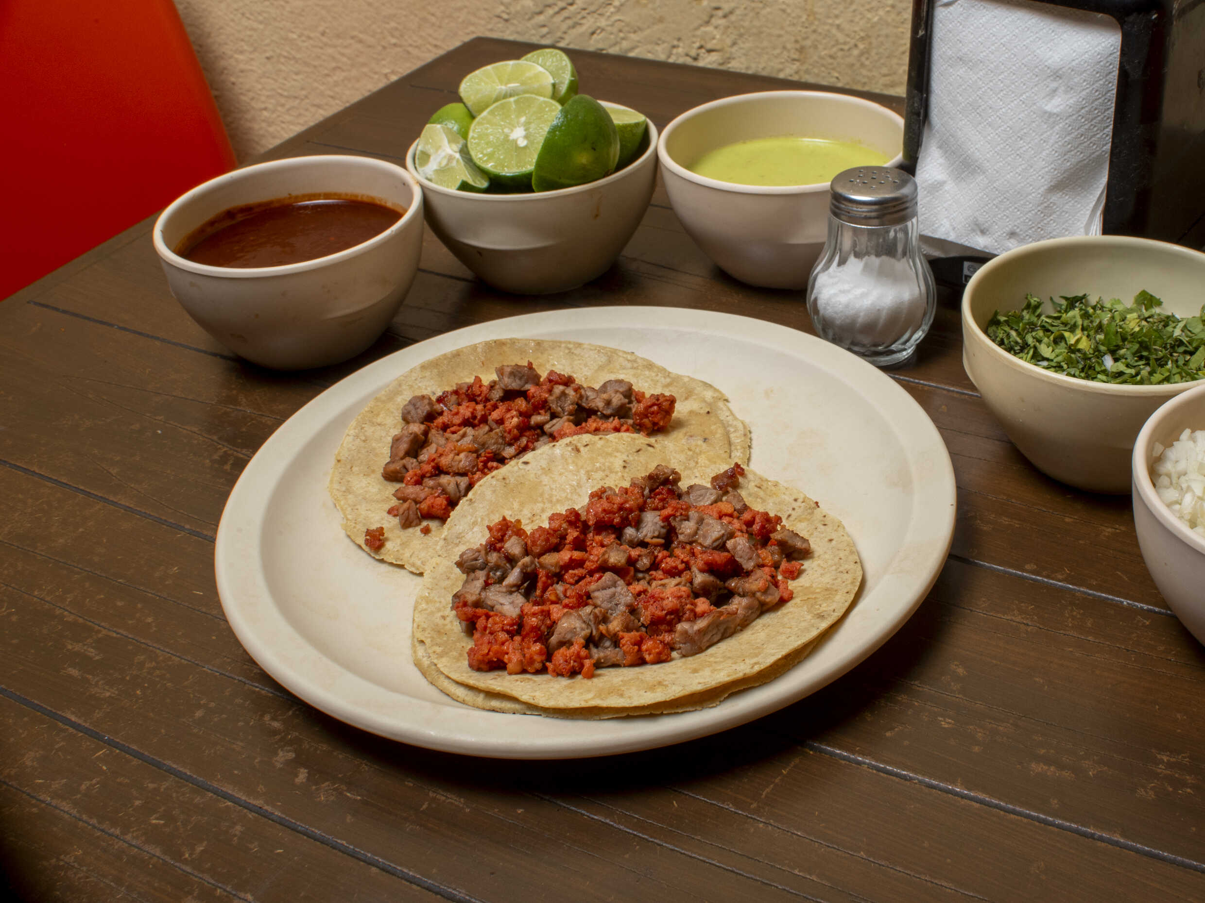 3 Tacos de bistec con doble tortilla, cebolla y cilantro, limones y salsa.