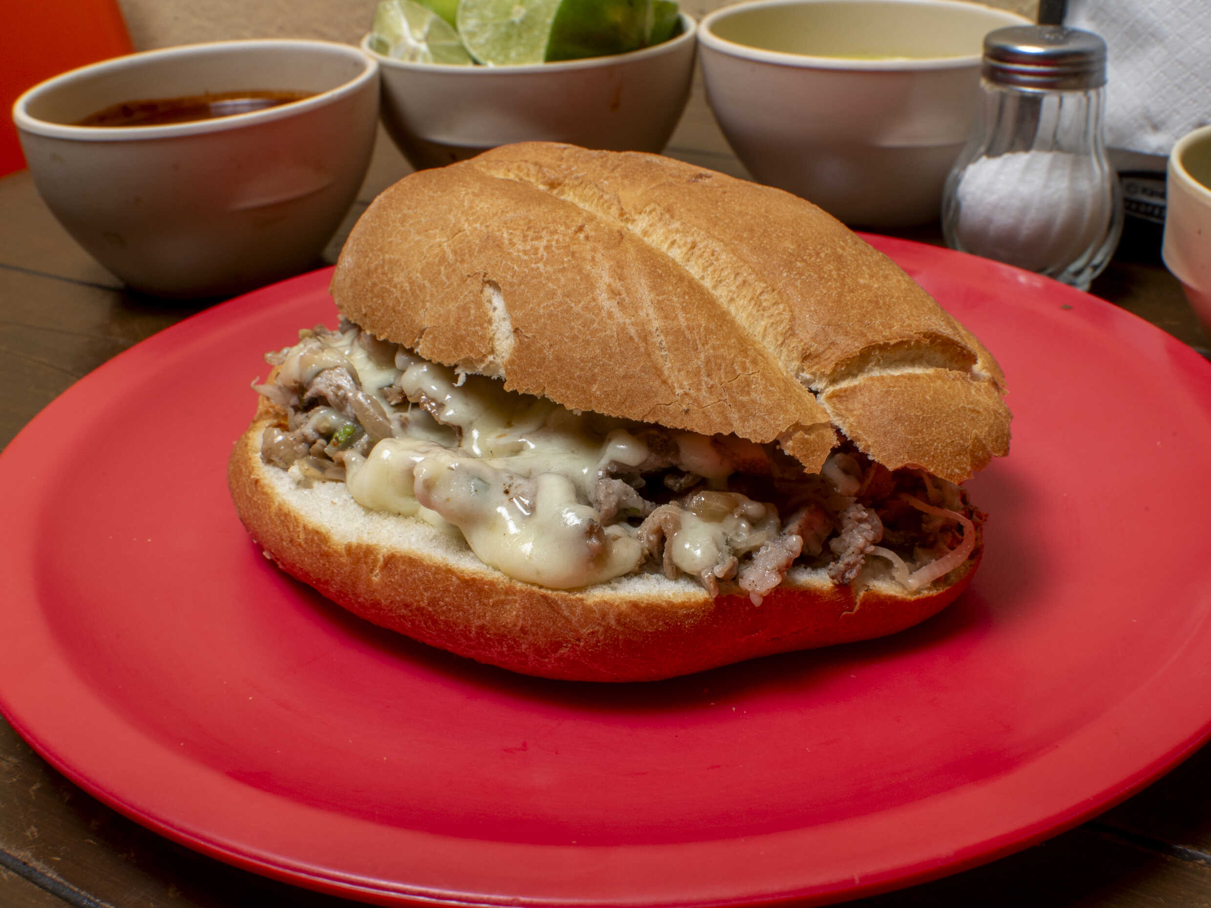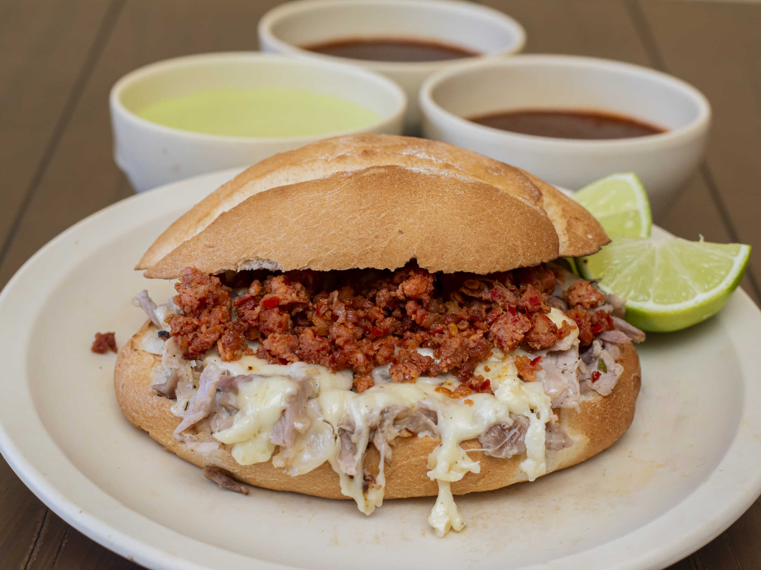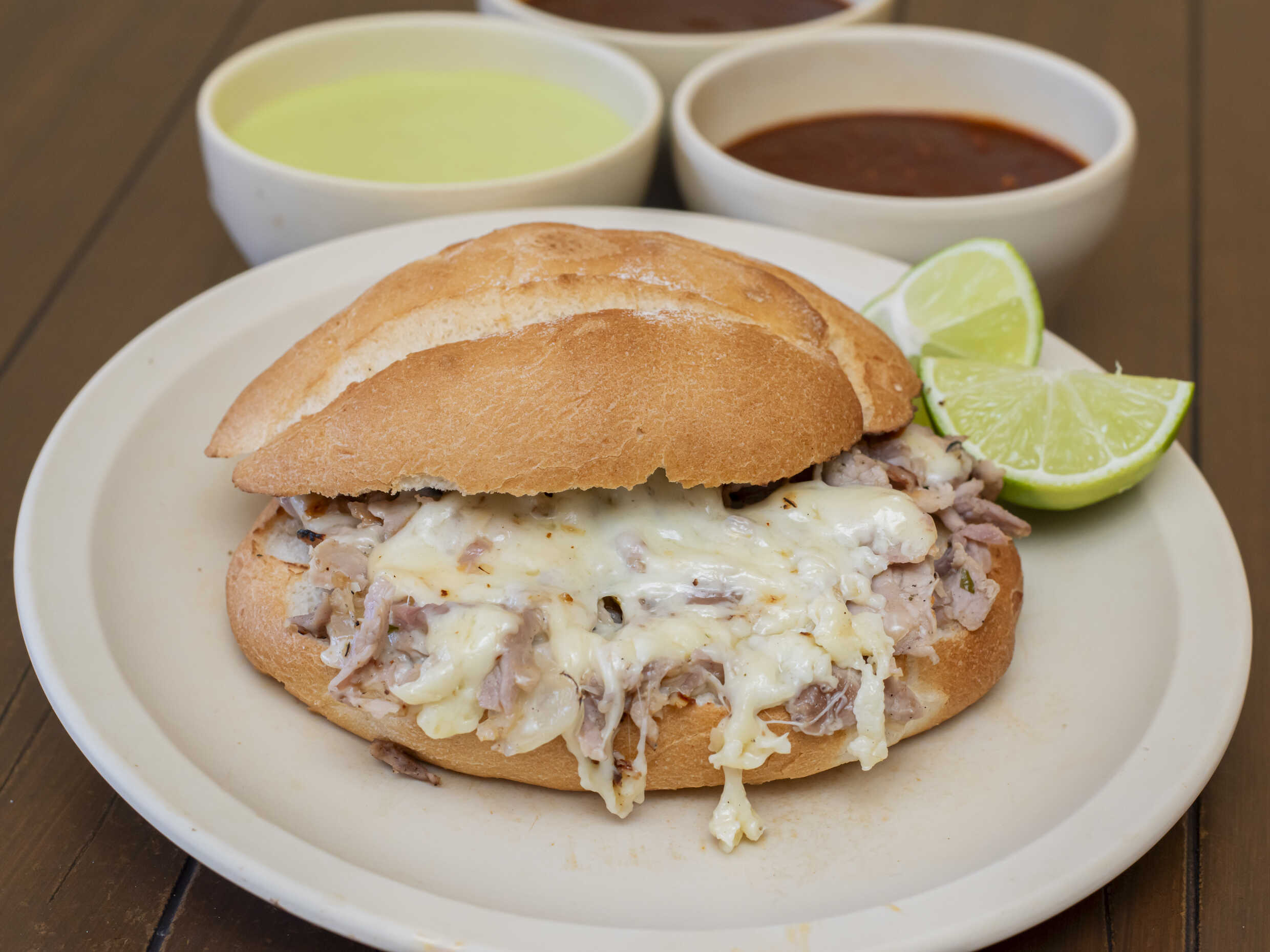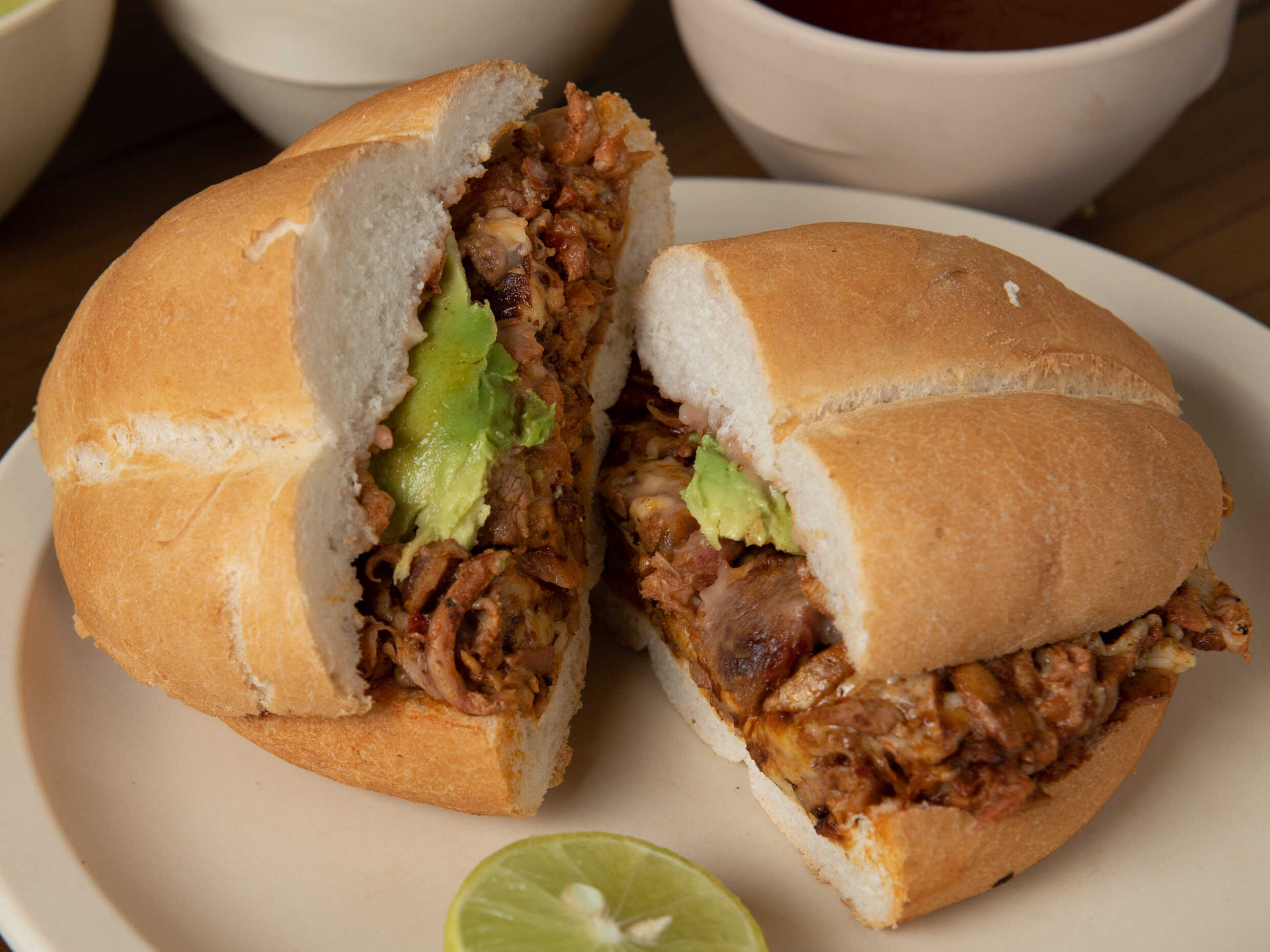 1 pieza individual: Torta Cubana con bistec, chorizo y pastor, acompañada de queso, aguacate y frijoles.
