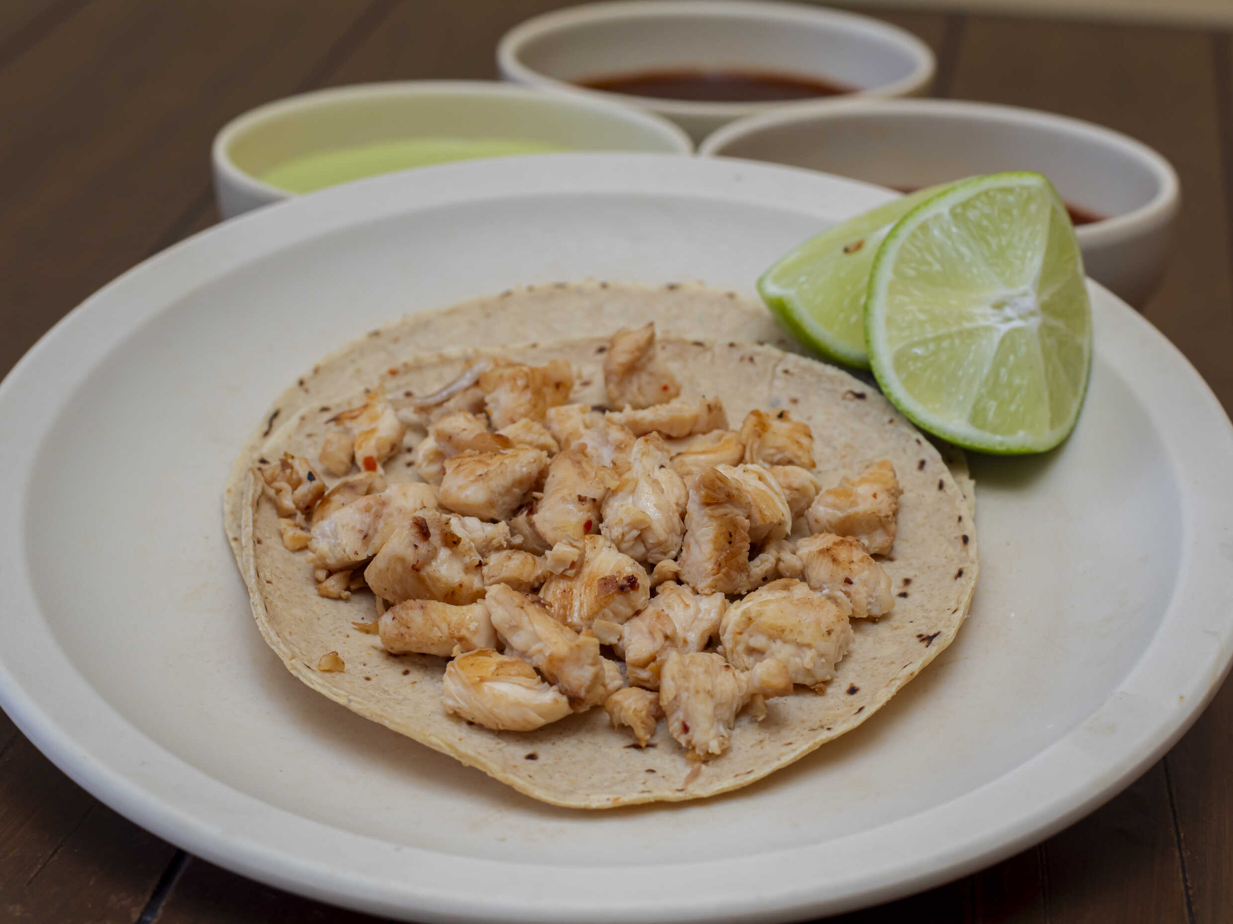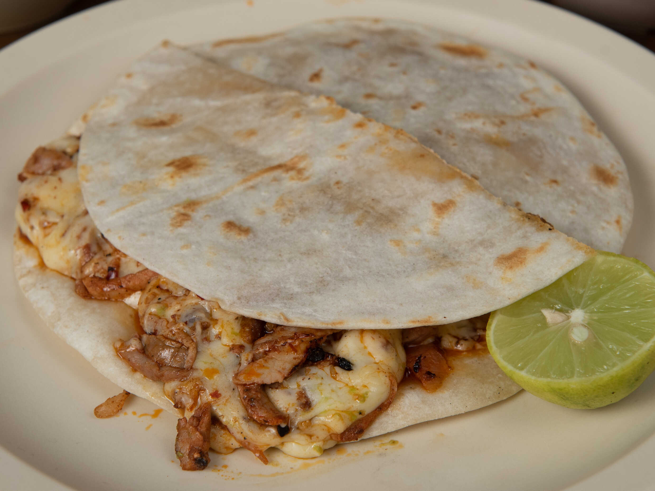Dos tortillas de harina rellenas de queso y pechuga de pollo asada.