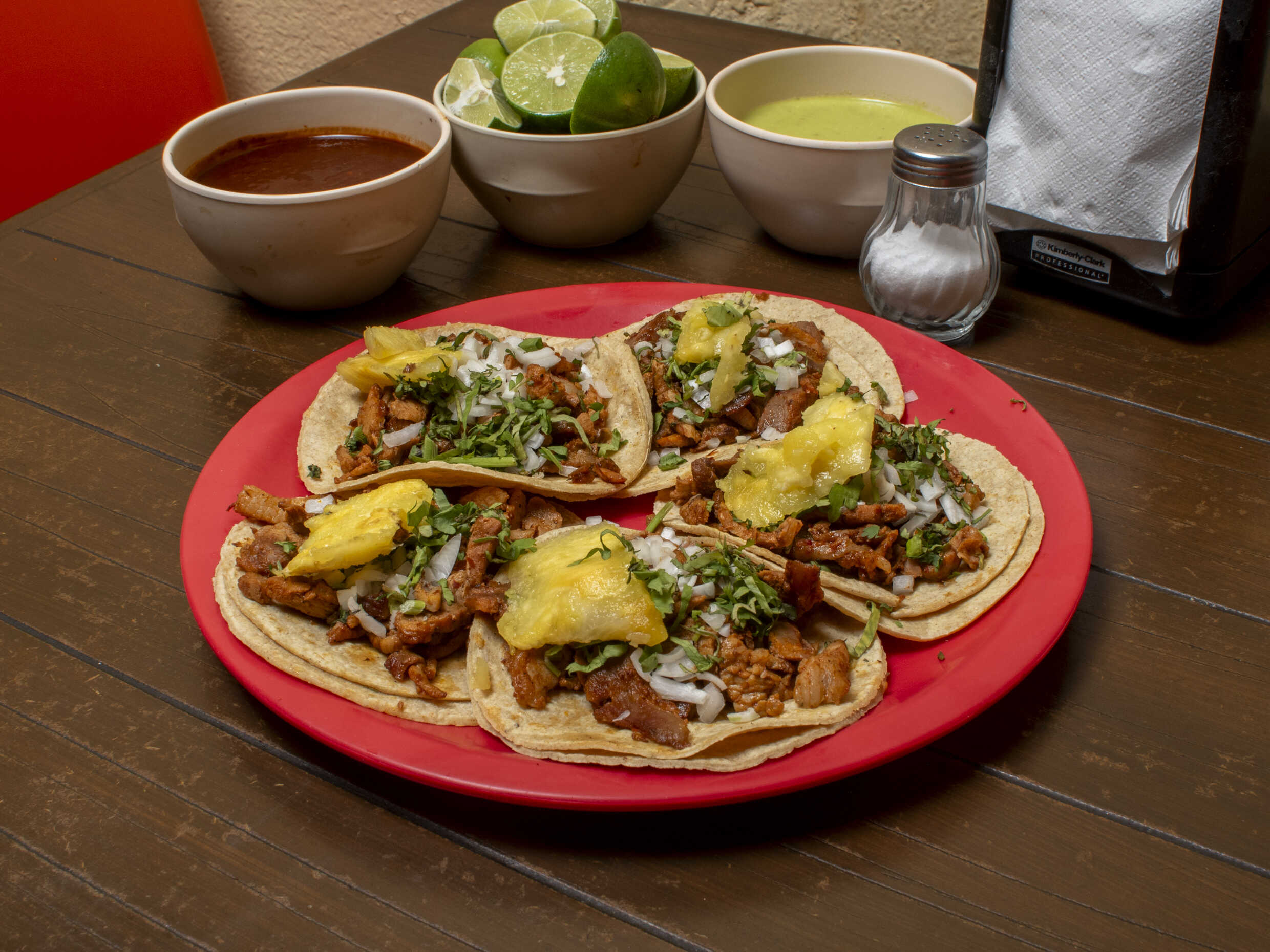 Rico taco al pastor, en tortilla taquera, con cebolla cilantro y piña ya incluido, limones y salsa.
