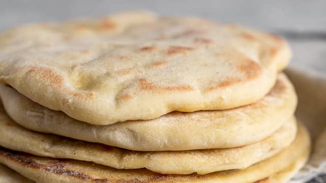 Dos tortillas de harina rellenas de queso y carne árabe.