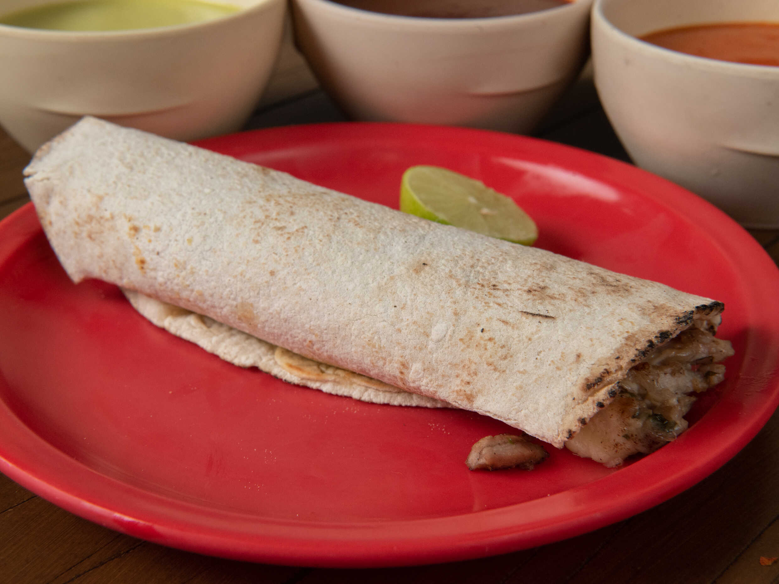 Dos tortillas de harina rellenas de queso y carne a elegir.