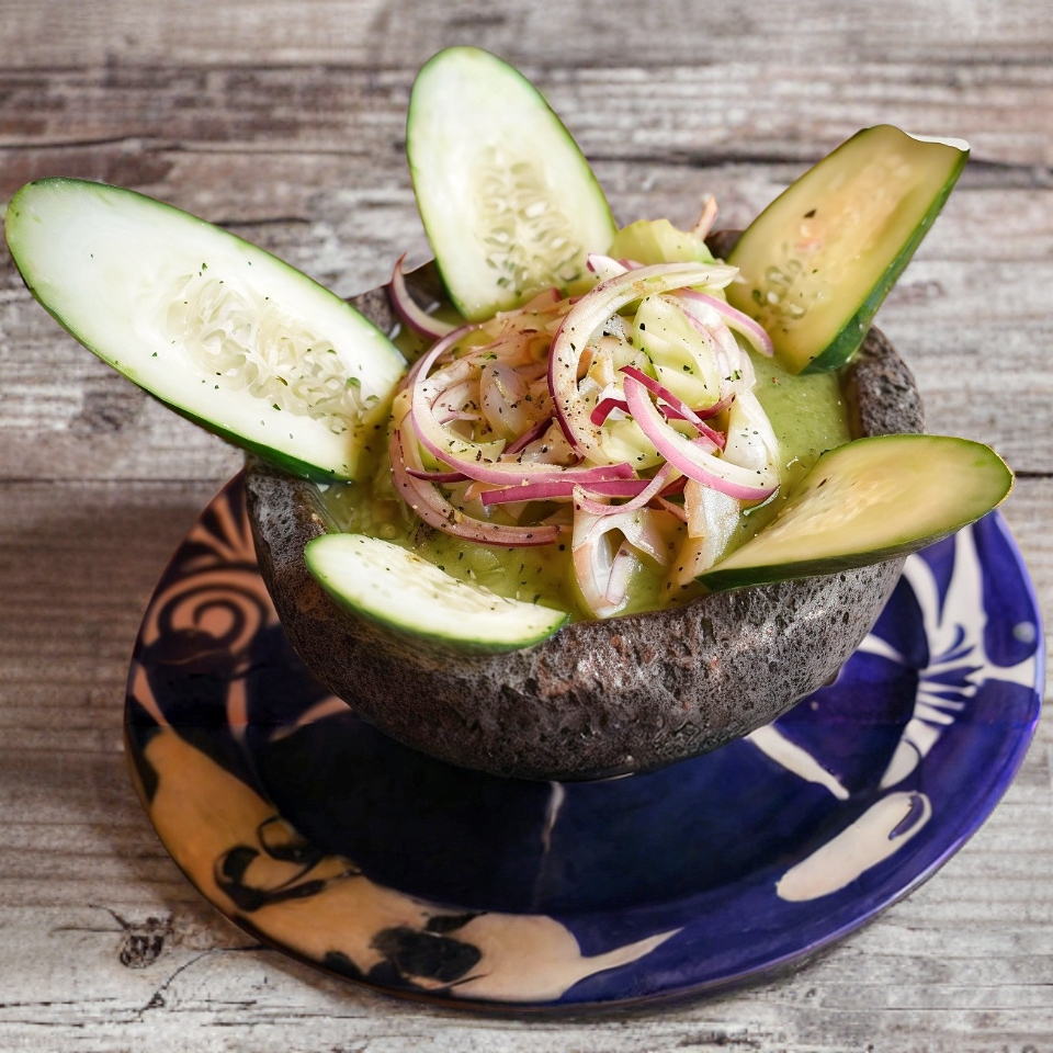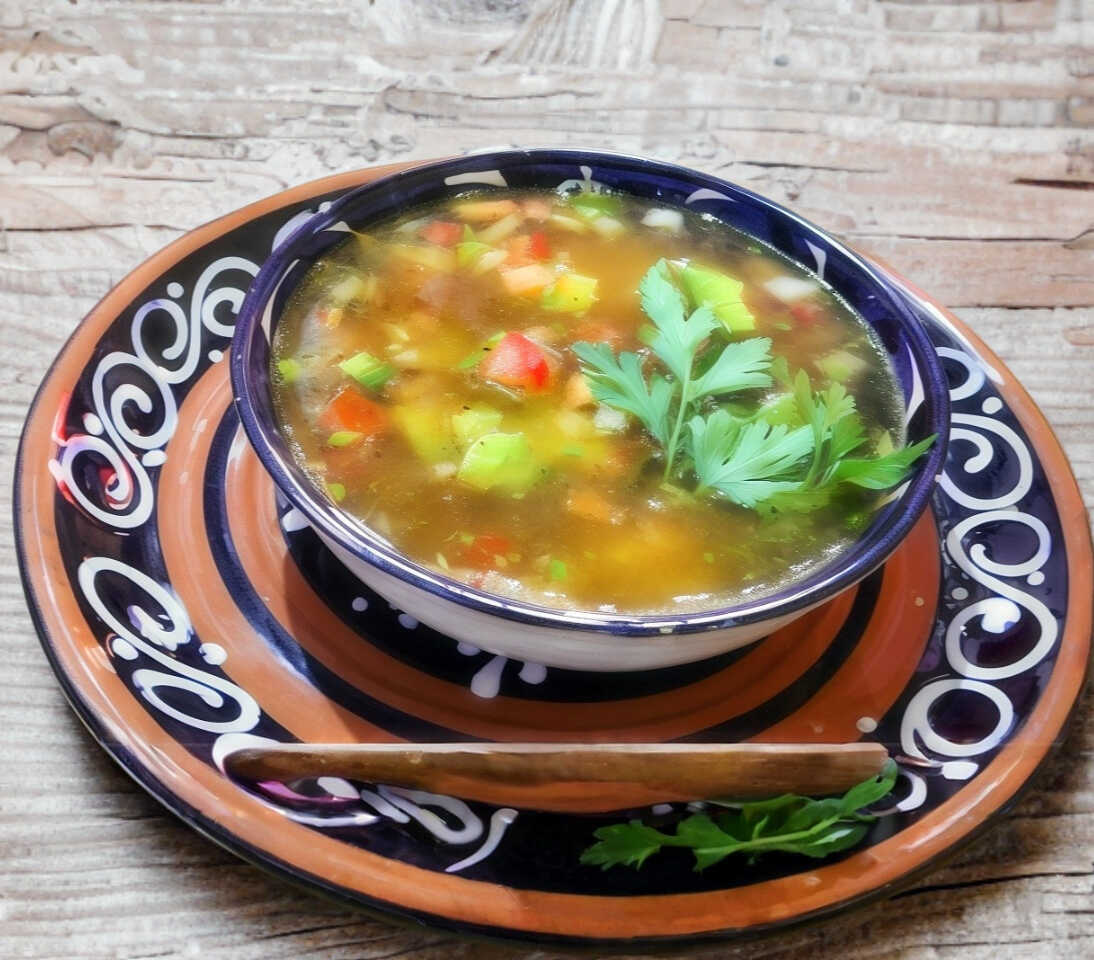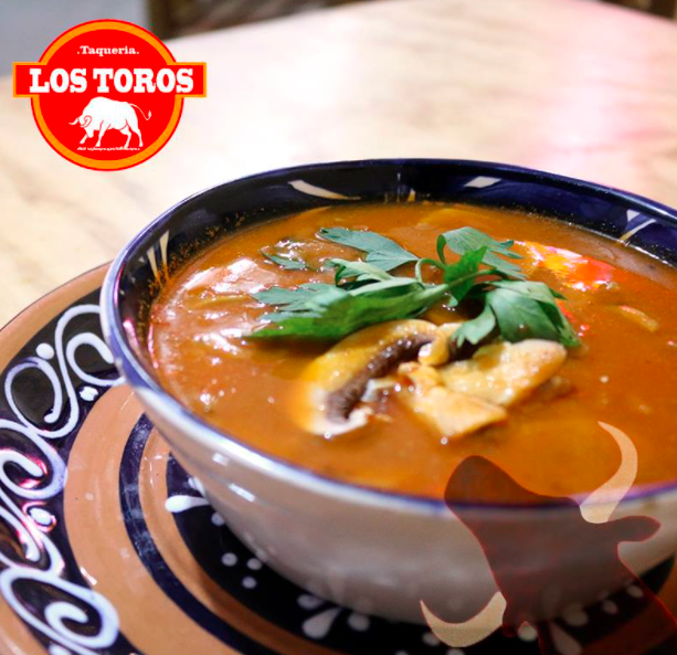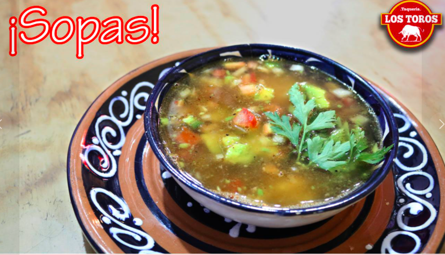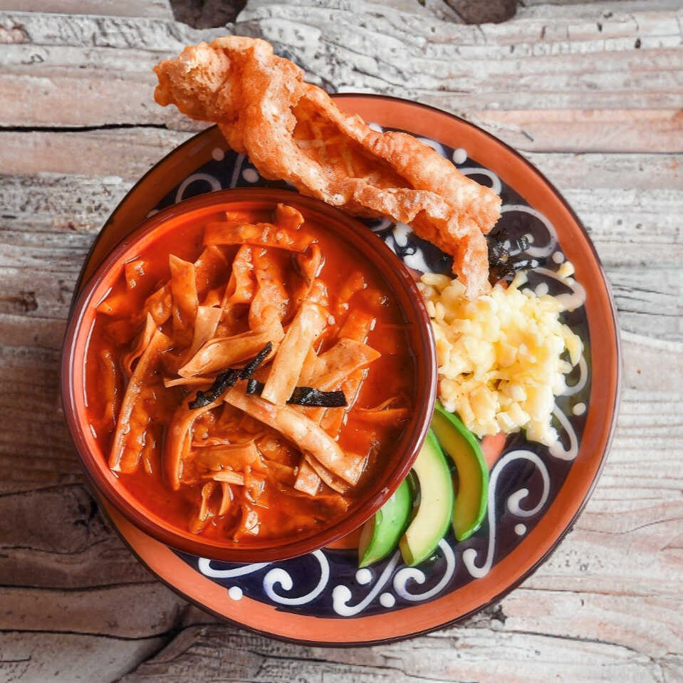400 ml., crujientes tiras de tortillas de maíz fritas en caldillo de frijol, acompañadas de aguacate.