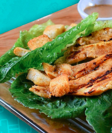 300 gramos, lechuga orejona, queso parmesano, crotones y aderezo César.