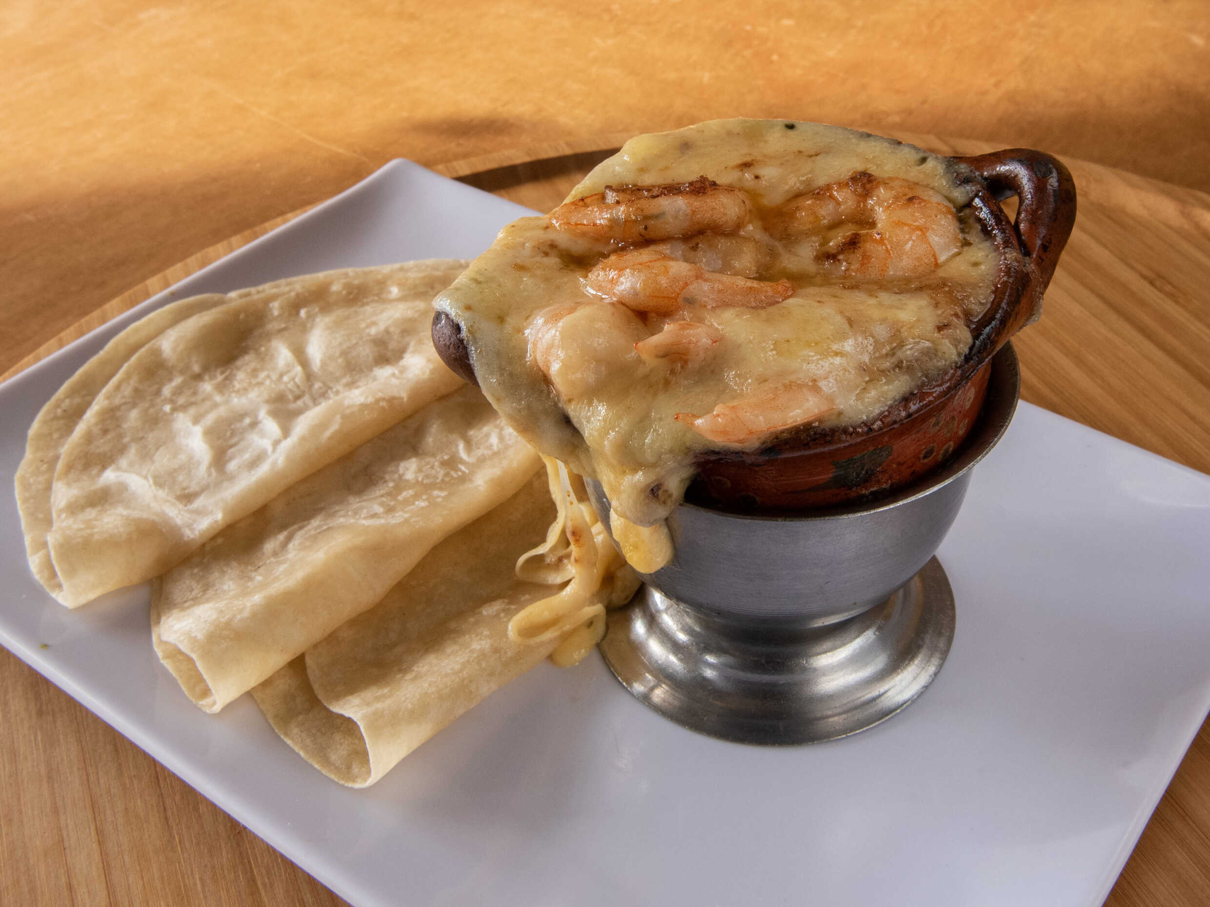 750 gramos, pimientos, cebolla, queso y 15 tortillas de maíz.
