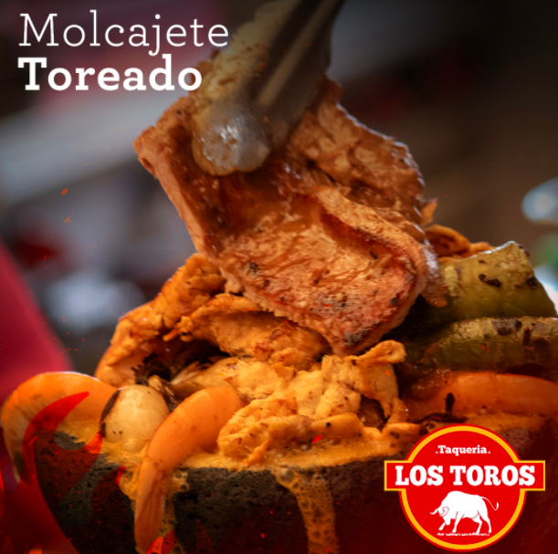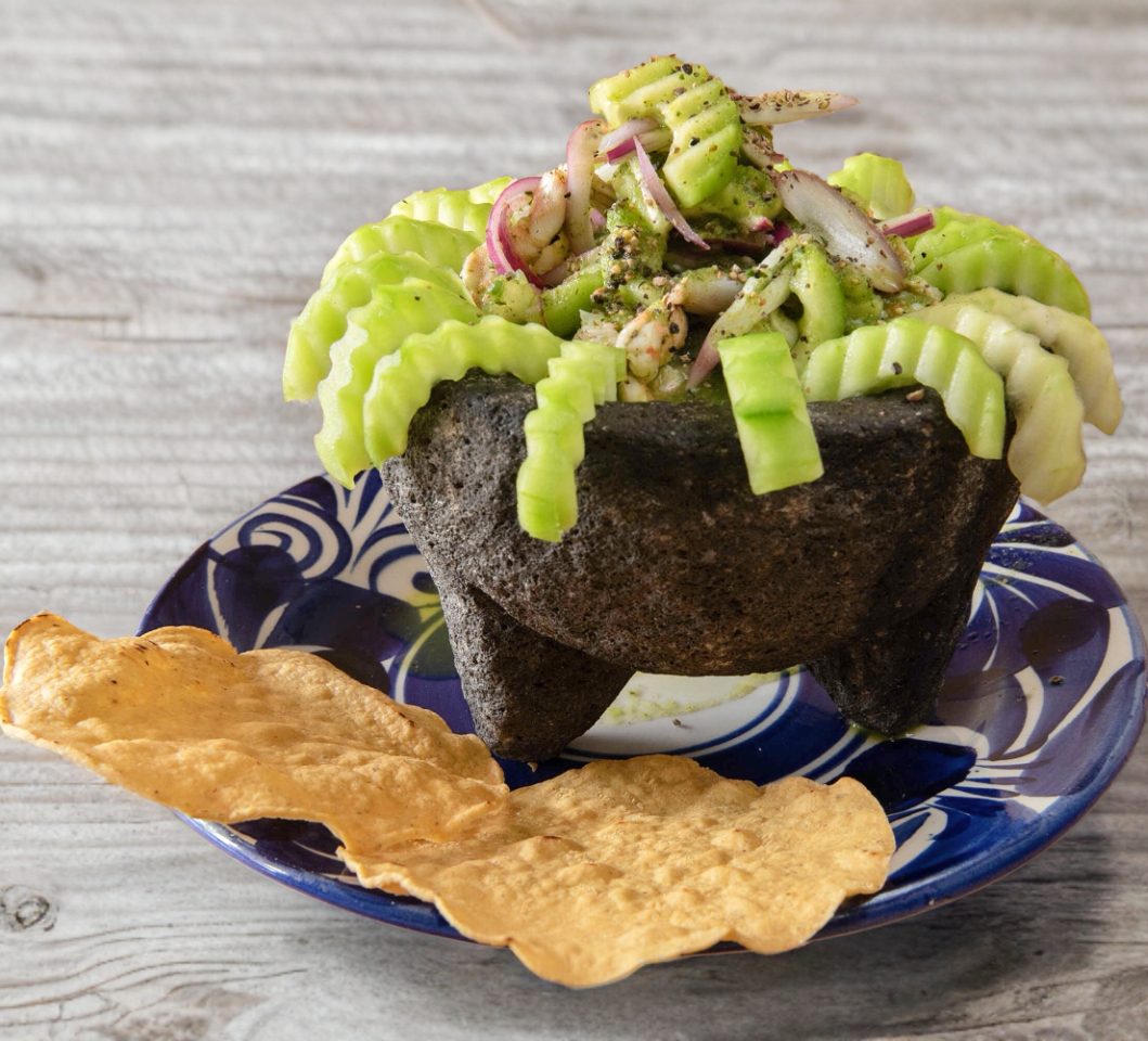 1000 gramos, molcajete mar y tierra, deliciosa combinación de carnes y mariscos, acompañado de nopales cebollas asadas y un chile toro.