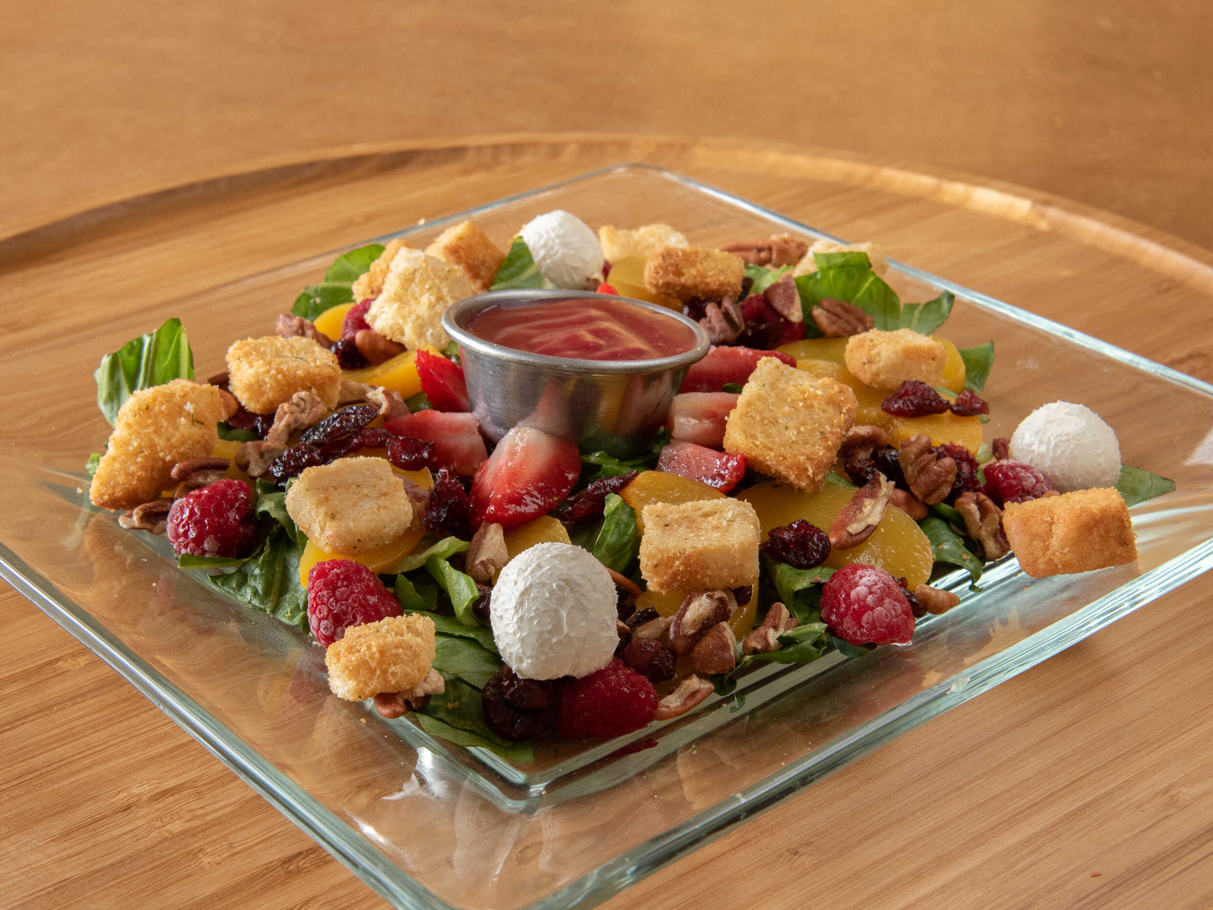 300 gramos, lechuga, espinacas, queso Philadelphia y queso de cabra, nuéz, arándanos, duraznos, crotones y aderezo de frutos rojos.