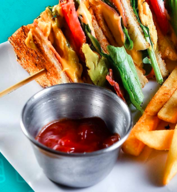 270 gramos, jamón de pavo, queso panela, tocino, germen de trigo, espinca con pan integral.