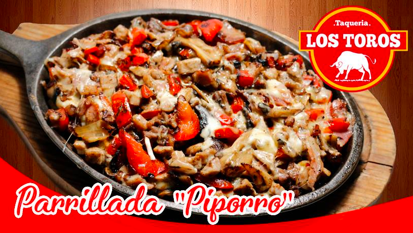 900 gramos, parrillada de bistec, morrón, cebolla, tocino, queso y 20 tortillas de maíz.