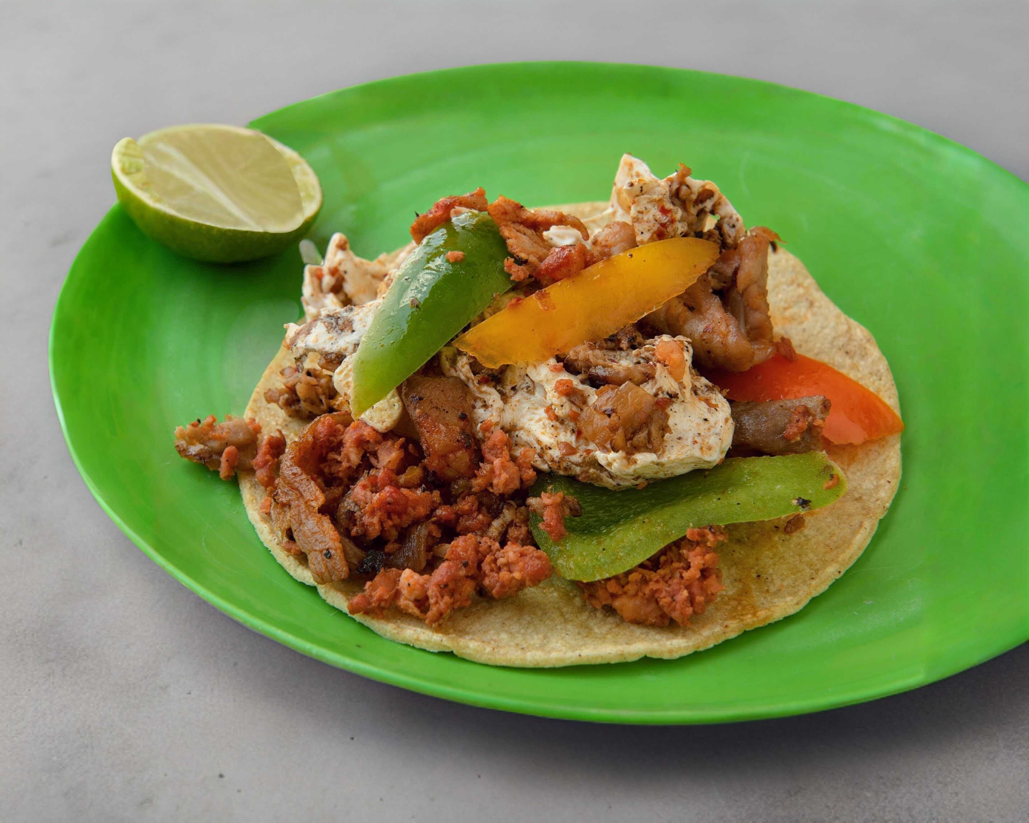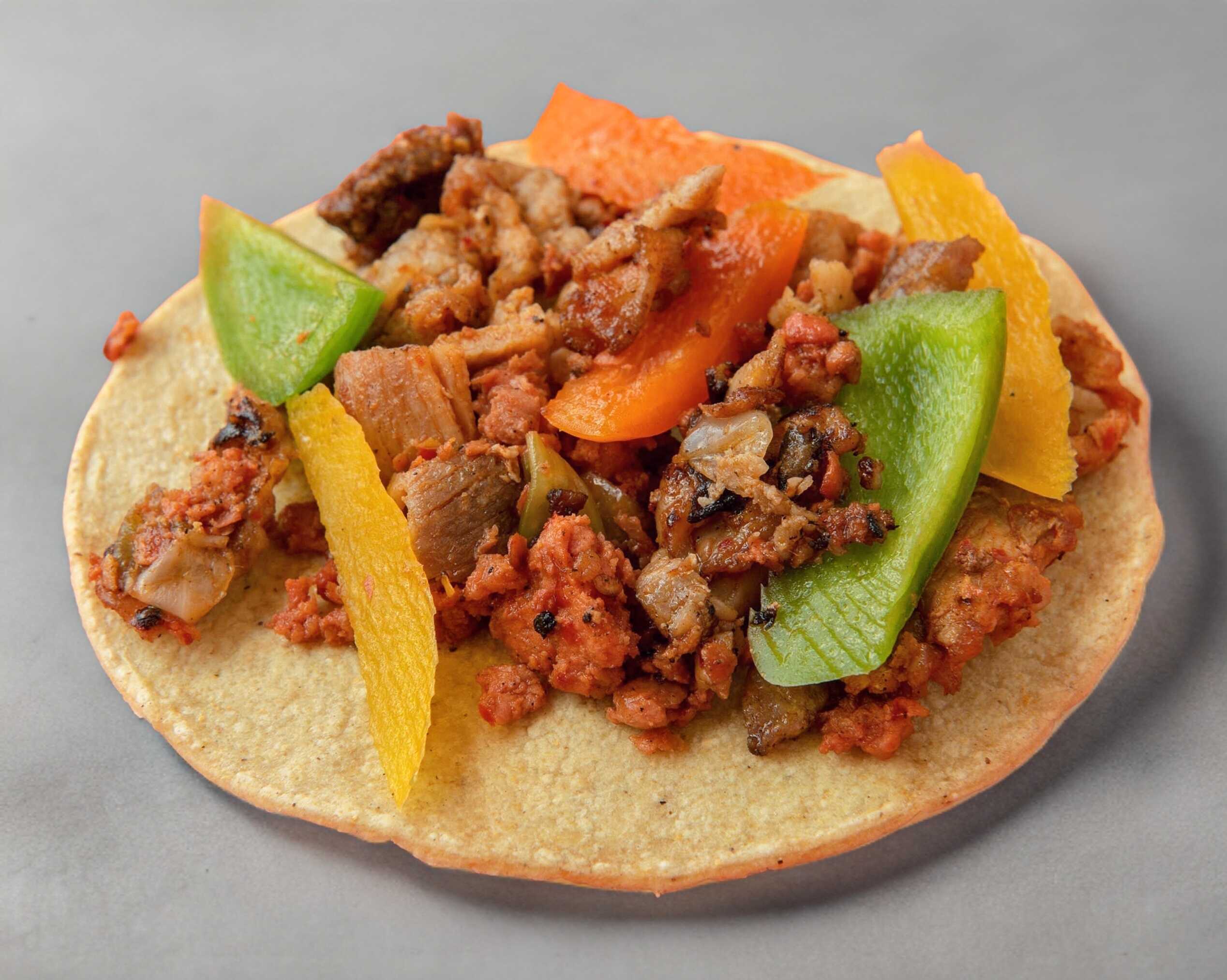 Taco en tortilla de maíz incluye carne de res, chorizo, cebolla y cilantro.incluye salsas
