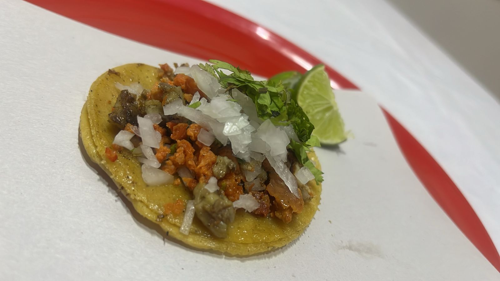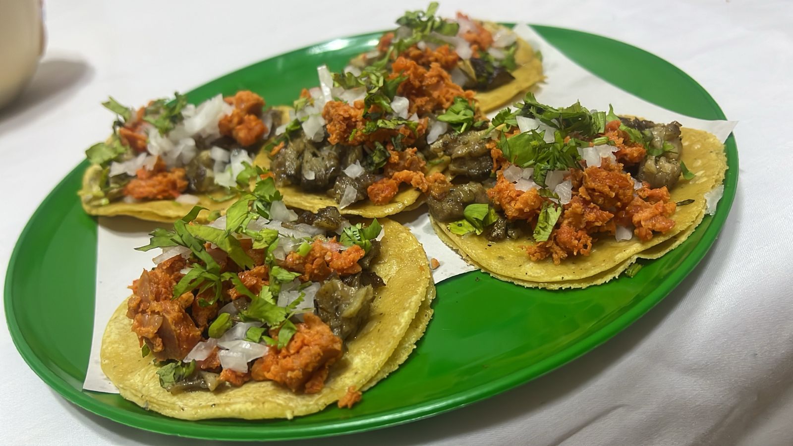 Son 5 deliciosos taquitos de bistec con longaniza, vienen en tortilla de maiz taquera del #10