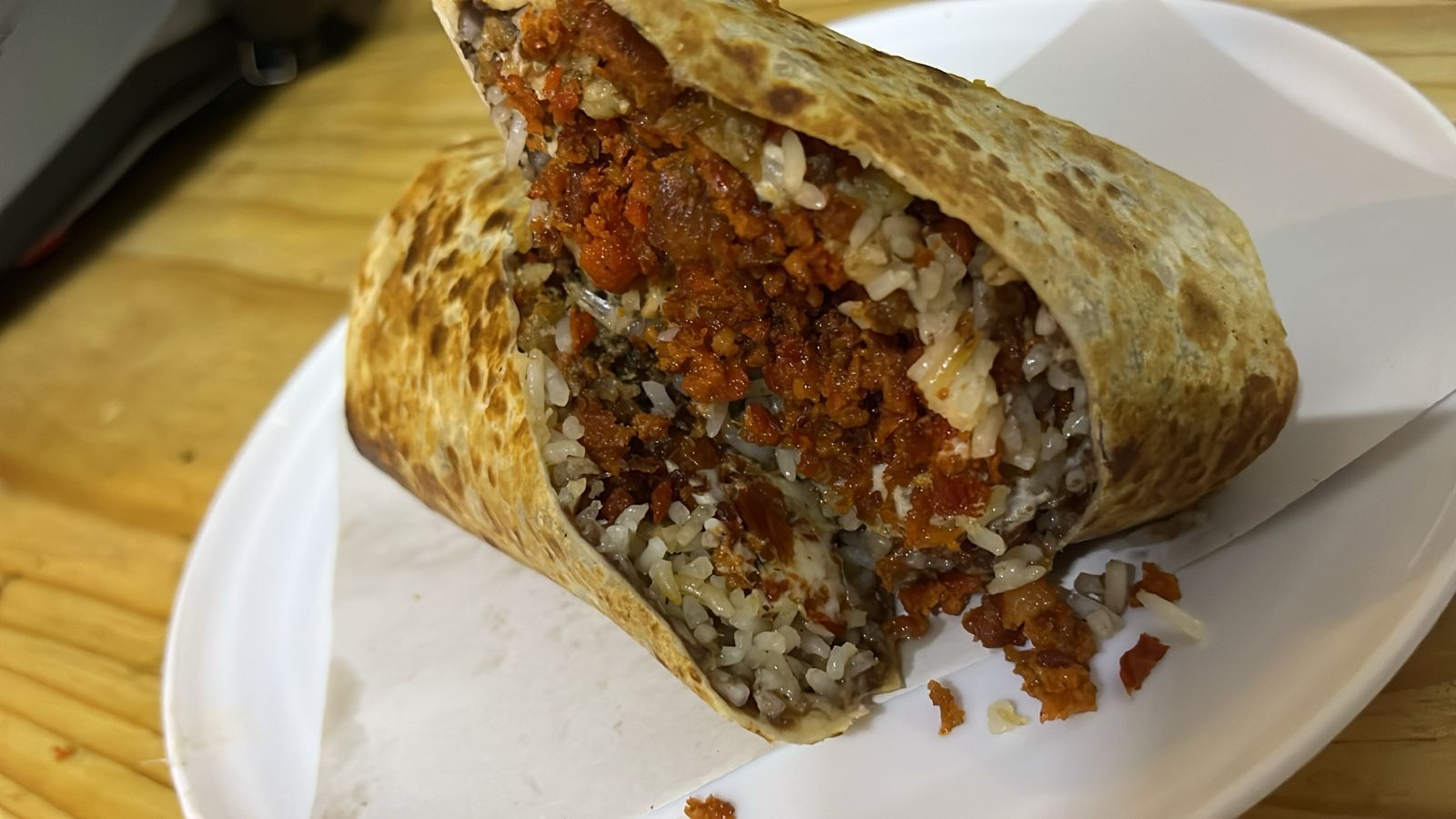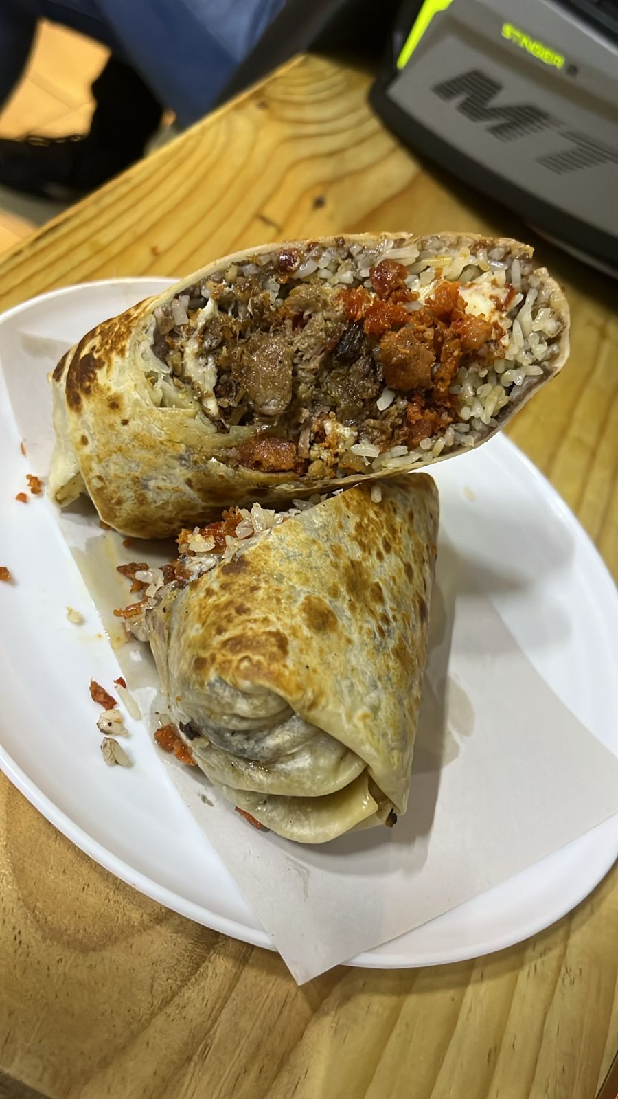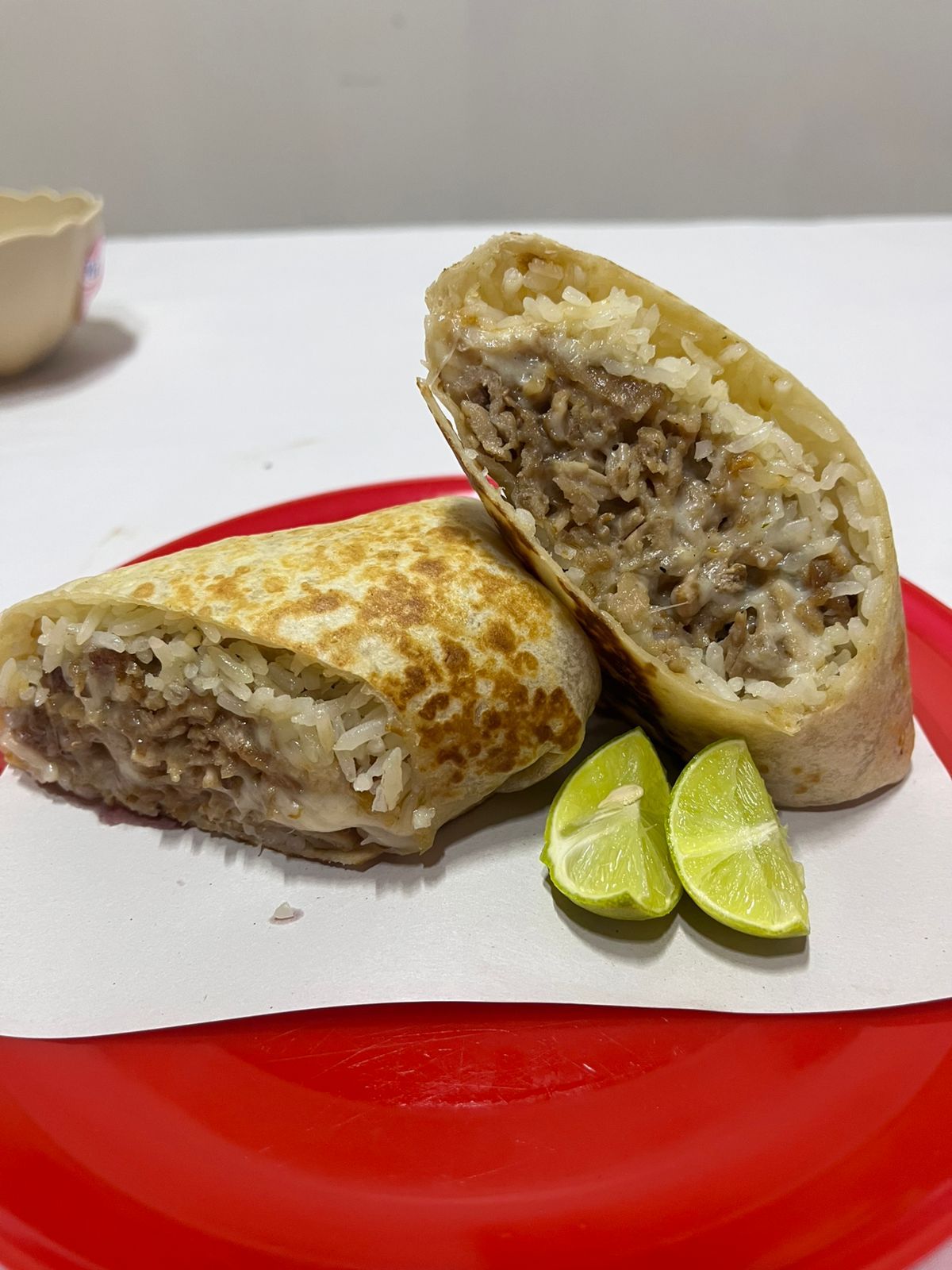 Burrito en tortilla de harina grande, relleno de riquisimo bistec con longaniza y quesillo.