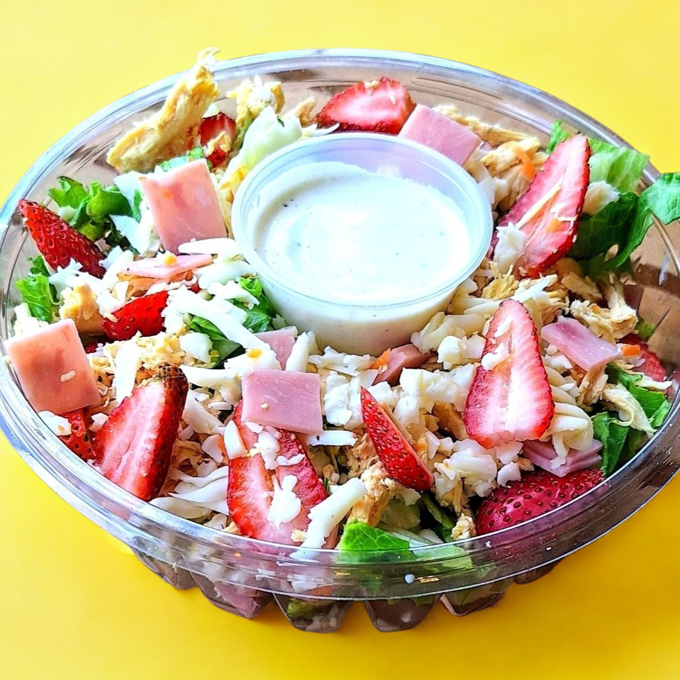 Pasta, pollo, jamón, queso gouda, fresas. | Aderezo (a elegir)