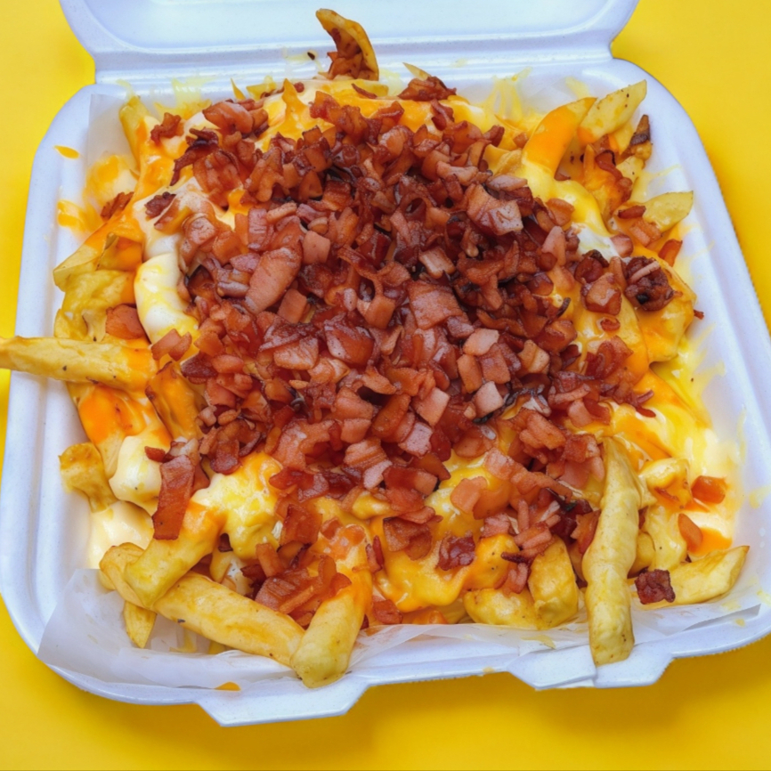 200 gr de papas a la francesa, ya van preparadas; con tocino, queso amarillo, queso manchego gratinado y salsa de queso. [IMAGEN DE REFERENCIA]