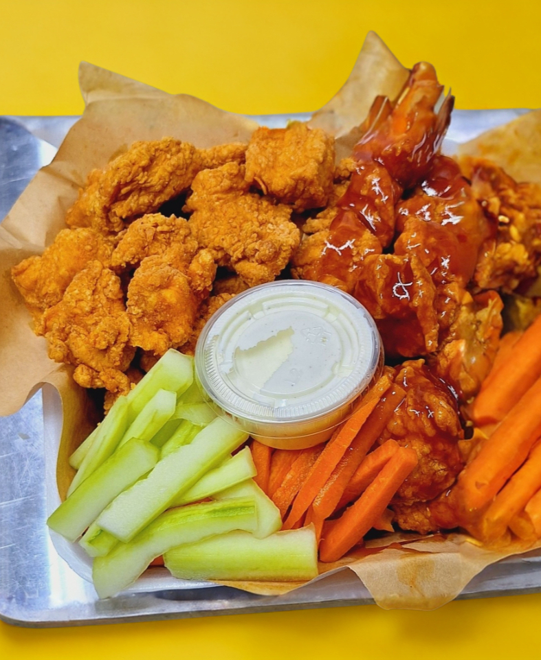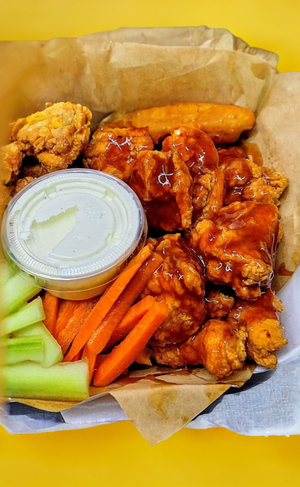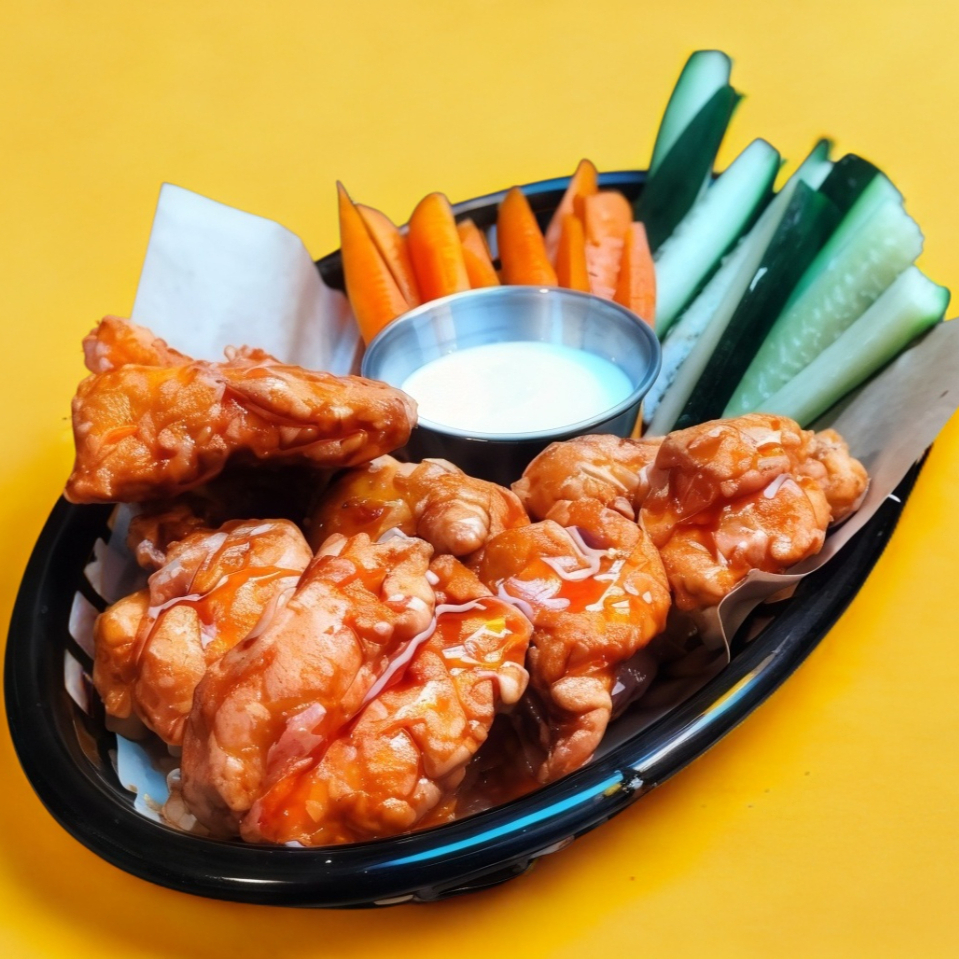 Alitas crujientes de pollo | Bastones de verdura | 2 salsas a elegir | Aderezo ranch.