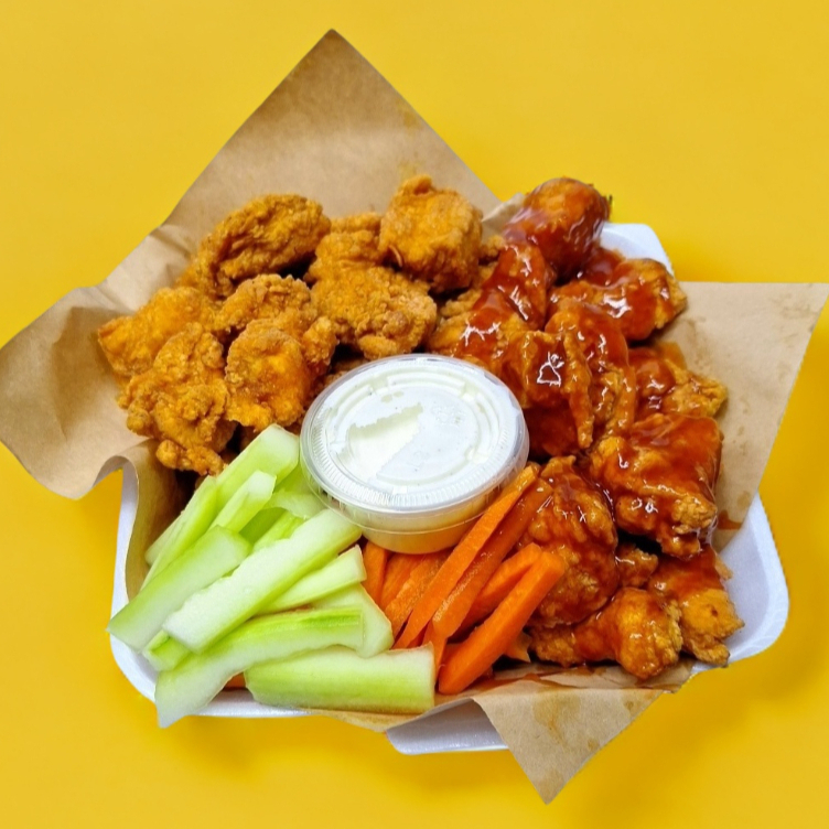 Trozos de pechuga de pollo | Bastones de verdura | 2 salsas a elegir | Aderezo ranch.