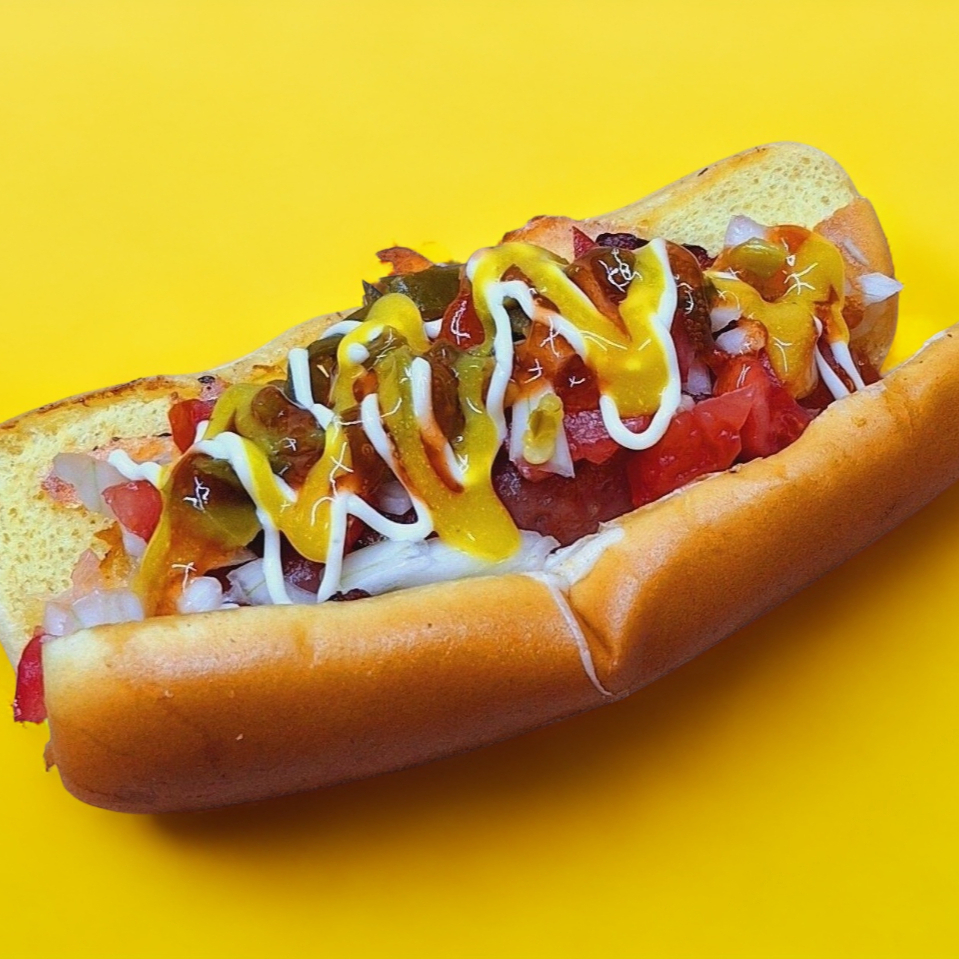 Salchicha, Tocino, Jamón, 2 Quesos | Papas a la francesa 90 gr | YA VA PREPARADO CON TODO, en caso de no desee algún complemento favor de notificarlo) Jitomate, cebolla, picante | Mayonesa, catsup y mostaza.
