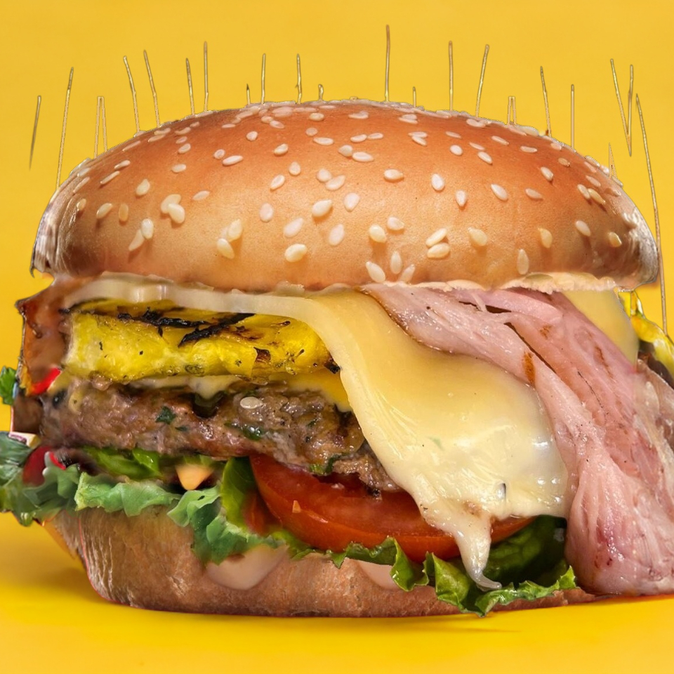Pan, carne de res, queso amarillo y extra tocino 60 gr. | Complementos (ya va preparada); catsup, cebolla, jitomate, lechuga, mayonesa, mostaza, picante y pepinillos [IMAGEN DE REFERENCIA].