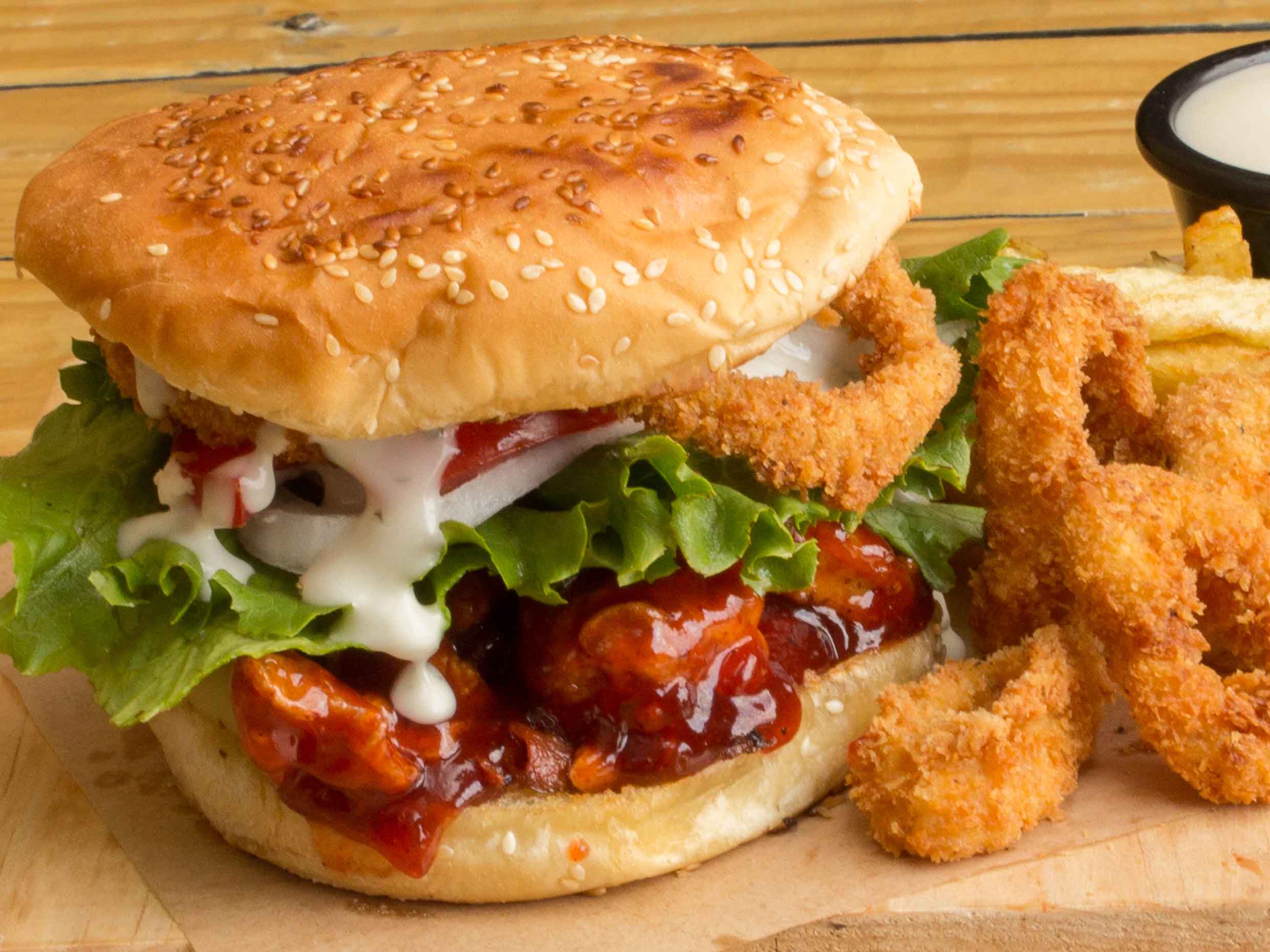 Con papas a la francesa >>Trozo de pechuga de pollo crujiente, aderezo de chipotle, aros de cebolla, tocino y queso gratinado. Complementos (ya va preparada); catsup, cebolla, jitomate, lechuga, mayonesa, mostaza, picante y pepinillos [IMAGEN DE REFERENCIA].
