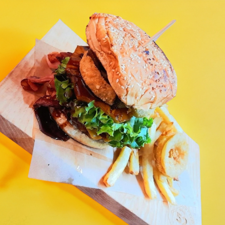 Burguer - "La Hawaiana"*1 + Burguer Extra Bacon*1 + Papas a la Francesa*1 + REFRESCO 600 ML.*2