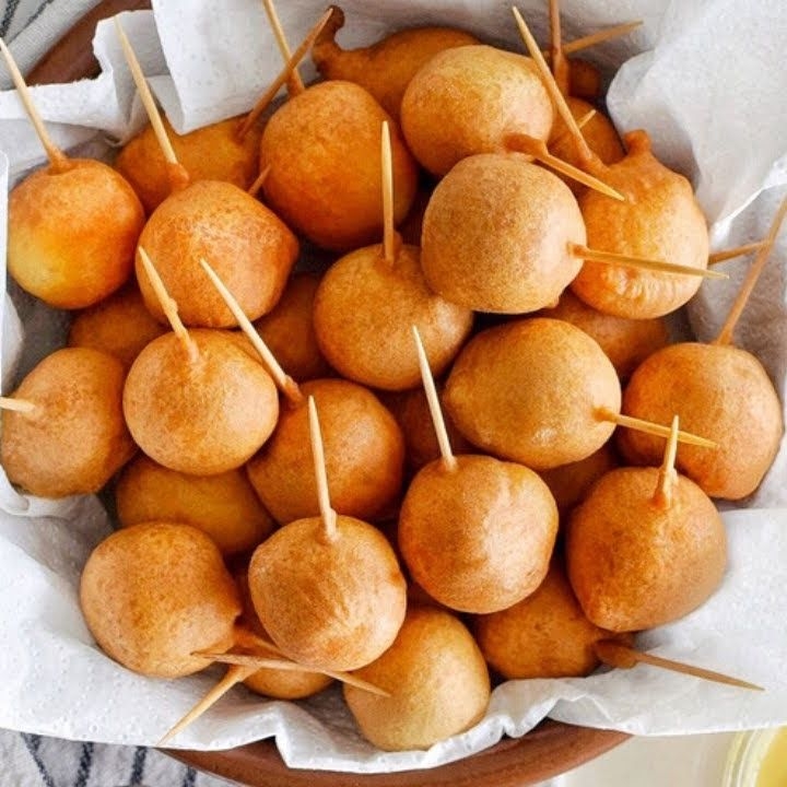 8 mini banderillas (salchicha y queso) - Papas a la francesa - boing - postre