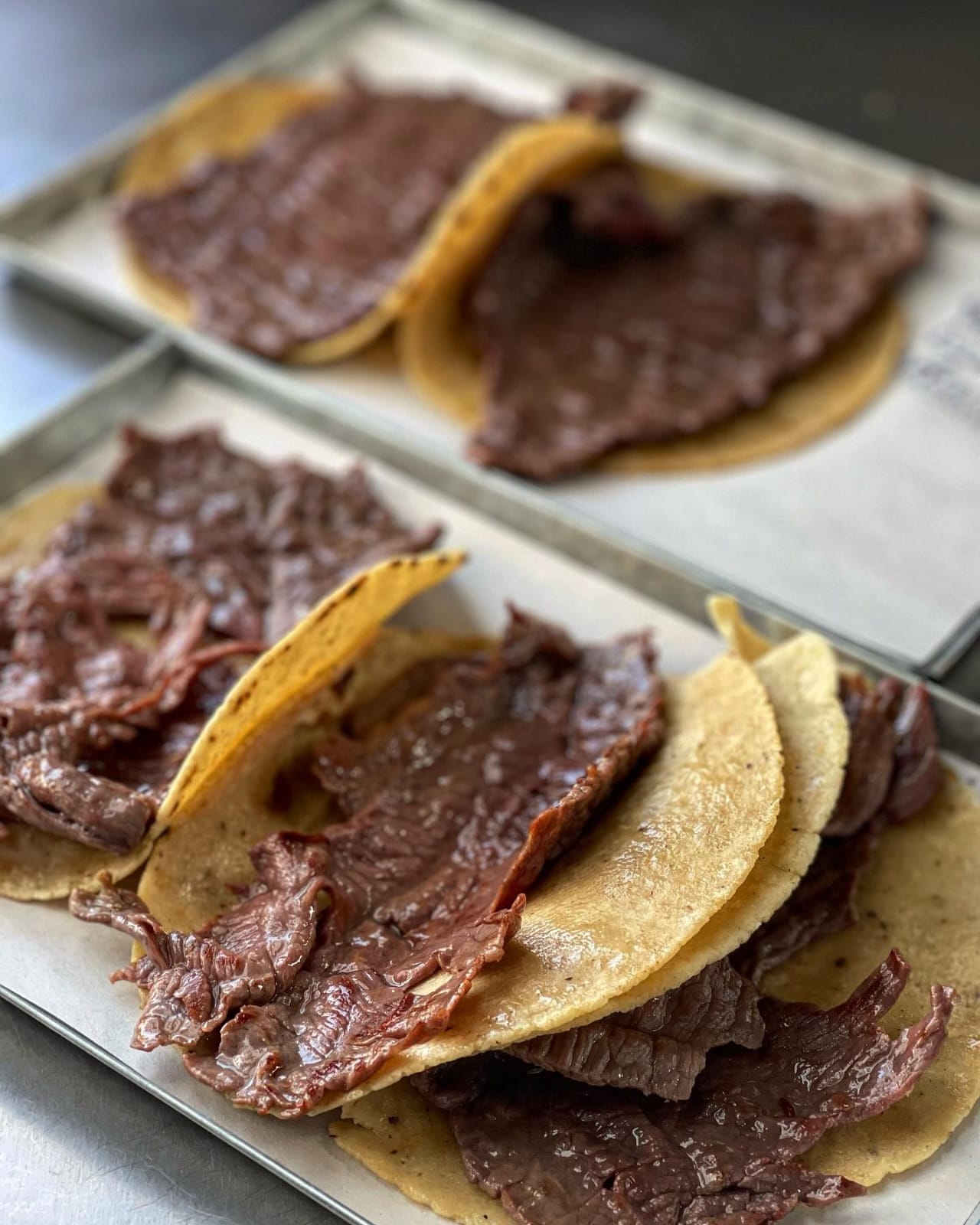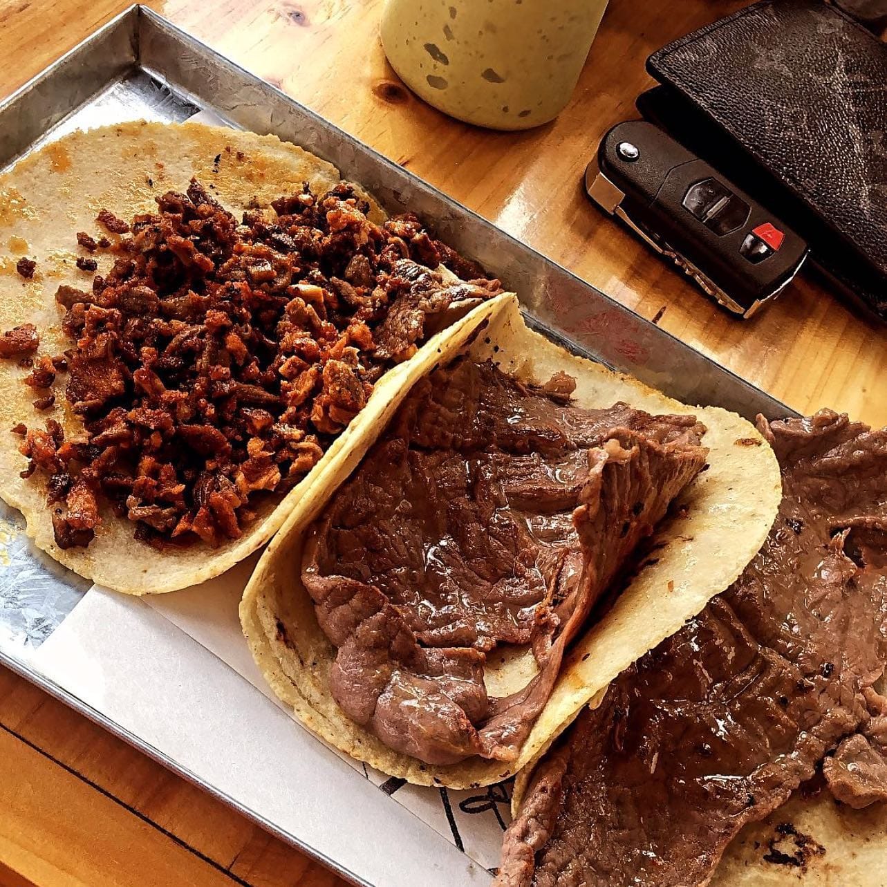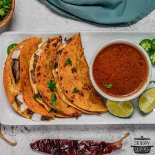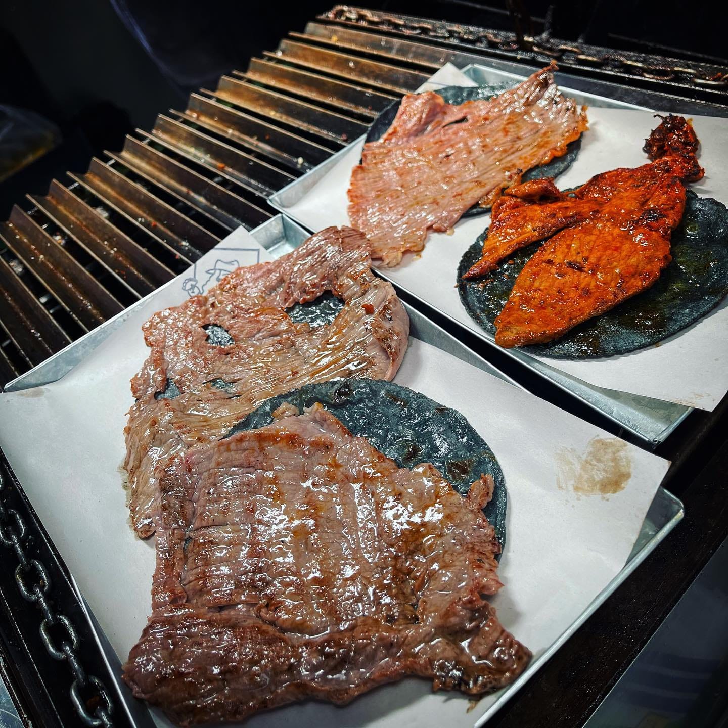 Tortilla de maíz con queso y carne, acompañada de cebolla, cilantro, salsa y limones