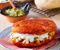 Relleno de papa con longaniza, lechuga, crema, queso. Acompañado de salsa