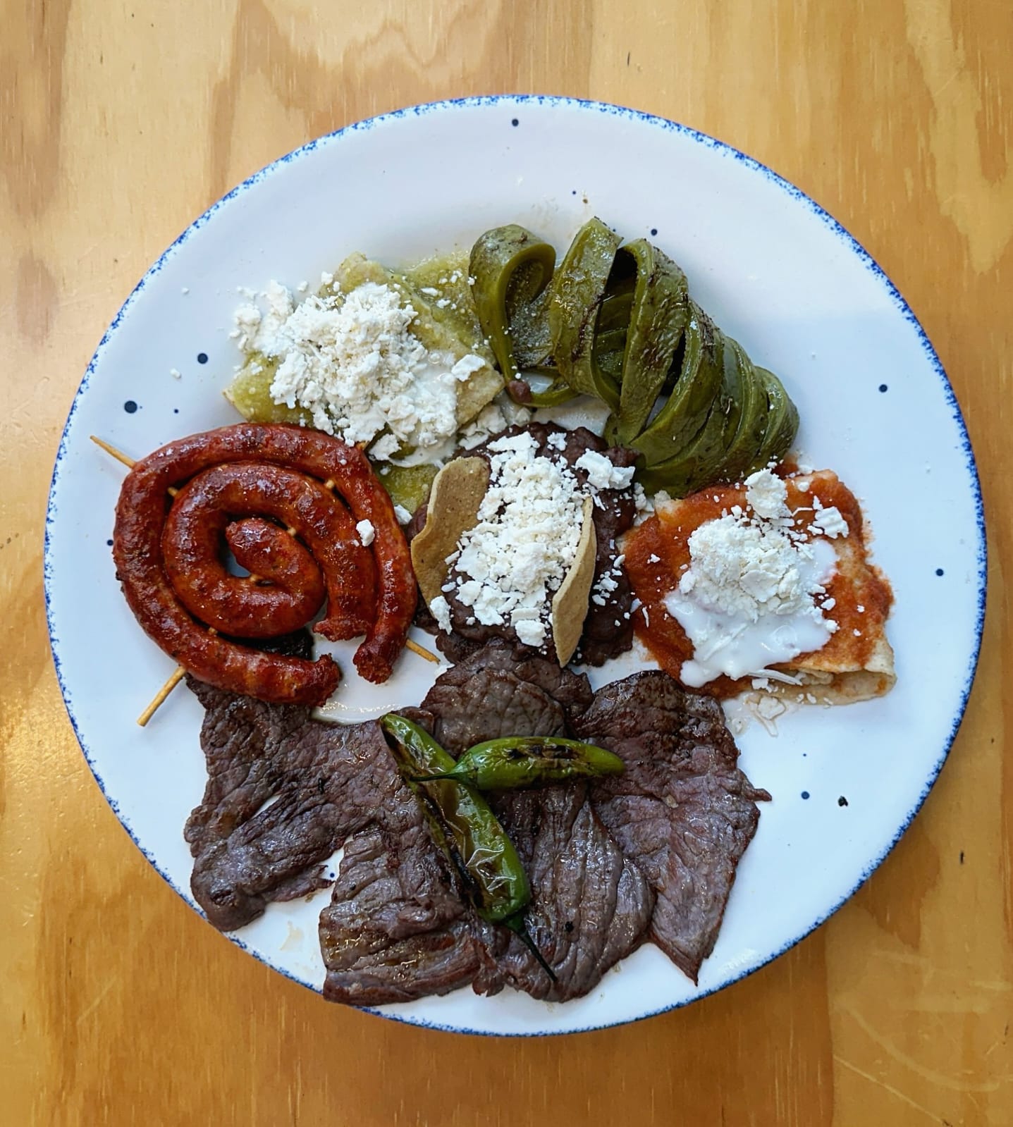 Base, queso oaxaca. A elegir: tinga, cecina natural, enchilada, longaniza.