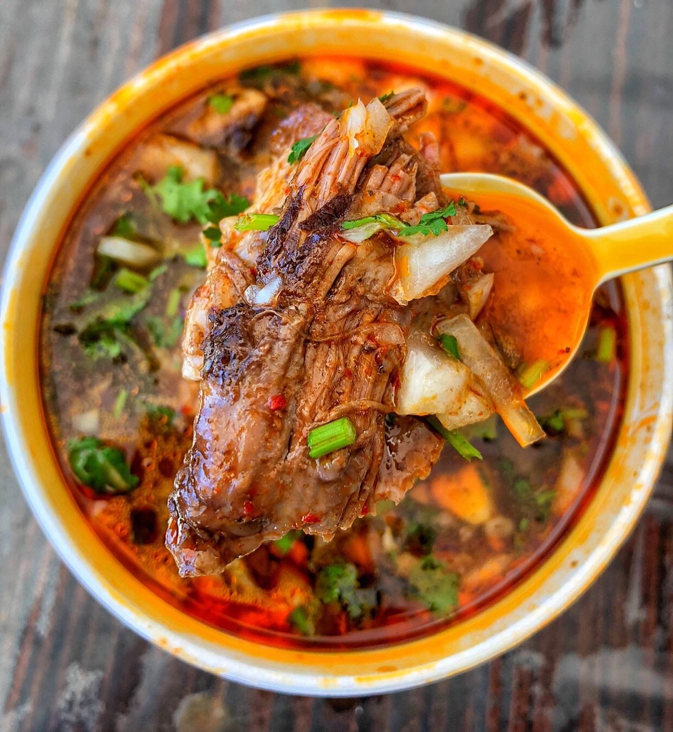 Un litro de consomé con carne, acompañado de cebolla, salsa, tortillas y limones