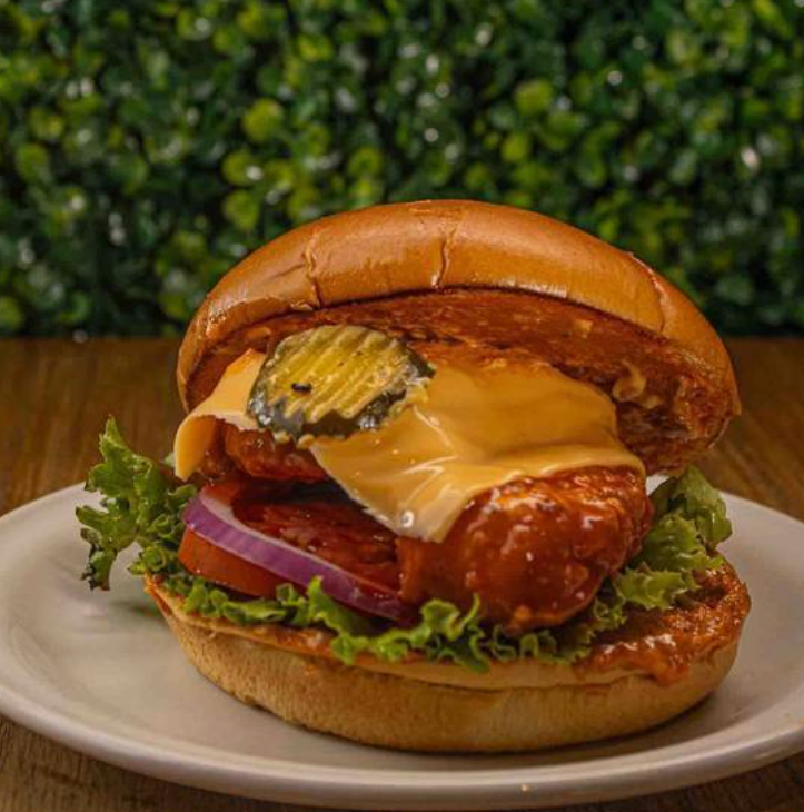 Hamburguesa con dos tiras de pollo bañadas en salsa búfalo, queso manchego y aderezo de pepinillo.