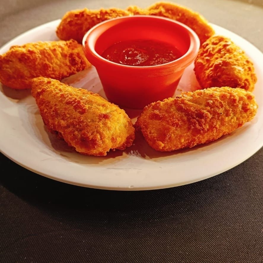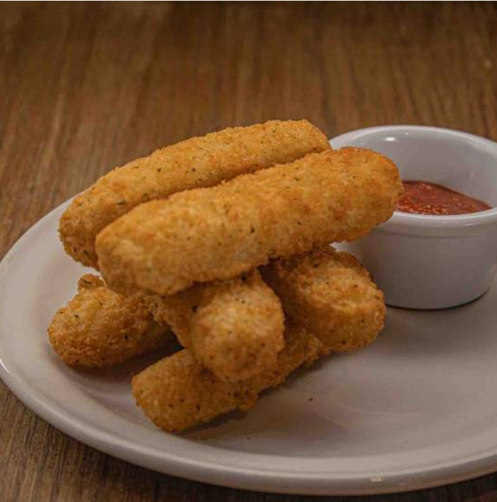 Irresistibles trozos de queso mozzarella empanizado y fritos acompañados con una deliciosa salsa de tomate, 6 piezas.