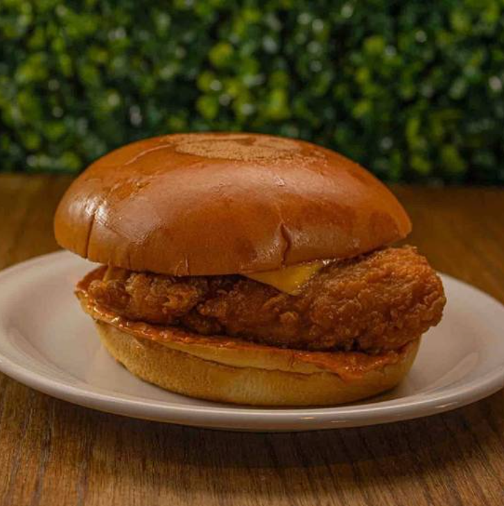 Hamburguesa con dos tiras de pollo acompañada de queso amarillo y aderezo de pepinillo.