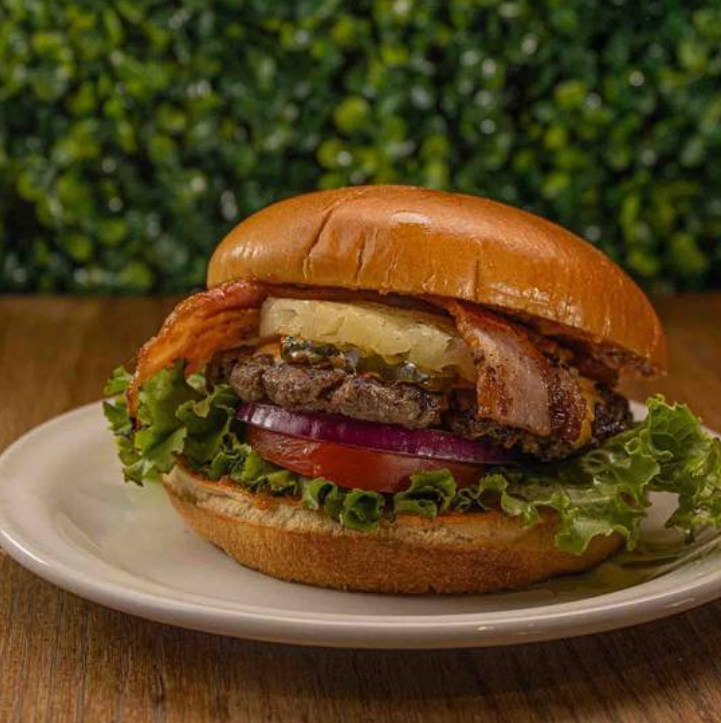 Deliciosa hamburguesa con 150 gramos de carne, queso amarillo, dos tiras de tocino crujiente y rodaja de piña jugosa y ligeramente caramelizada.