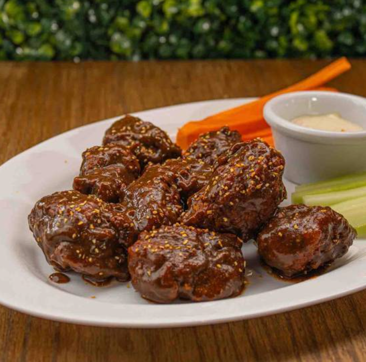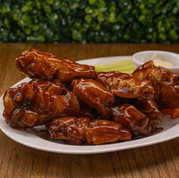 10 Piezas de deliciosas alitas de pollo jugosas y bañadas en una salsa de tu elección, acompañadas con zanahoria y pepino crujientes y un aderezo ranch.
