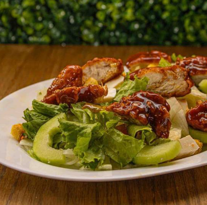 Mezcla de lechugas, aderezo ranch, pepino, cebolla morada, croutones, jitomate y queso panela acompañada con 2 tiras de pollo bañadas en salsa BBQ.