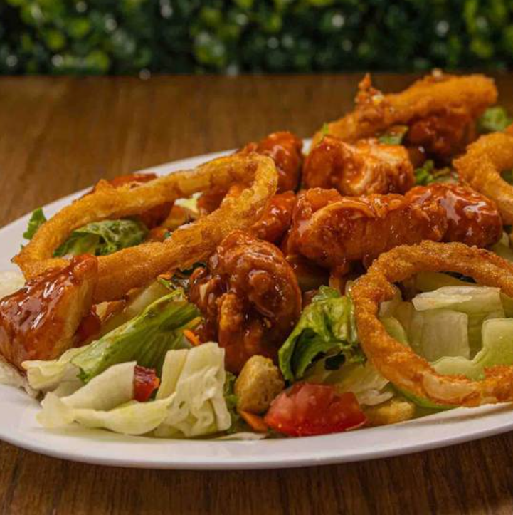 Mezcla de lechugas, aderezo ranch, pepino, aros de cebolla empanizados, croutones, jitomate y acompañada con 2 tiras de pollo bañadas en salsa búfalo.