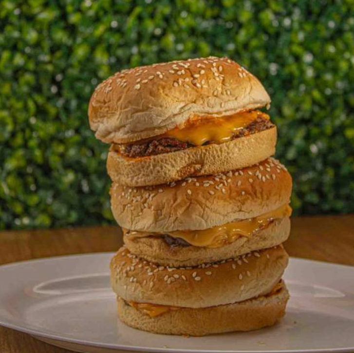 Tres capas de carne jugosa, apiladas una sobre otra, formando una impresionante torre de sabor.