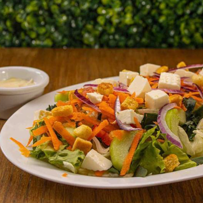 Mezcla de lechugas, aderezo ranch, queso panela, croutones, cebolla morada, zanahoria, jitomate y pepino.