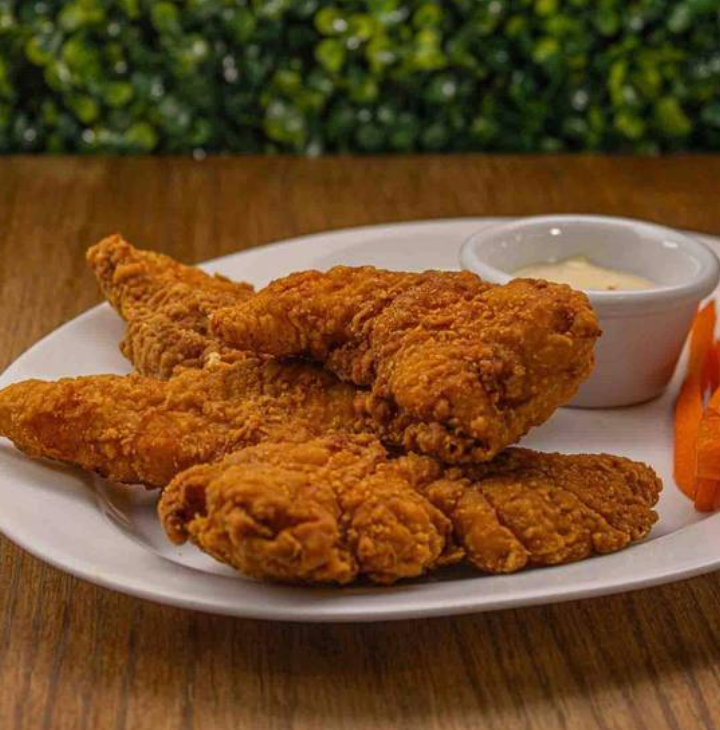 5 tiras de pechuga de pollo crujientes por fuera y jugosas y suaves por dentro, bañadas con una salsa de tu elección, acompañadas con zanahoria y pepino.
