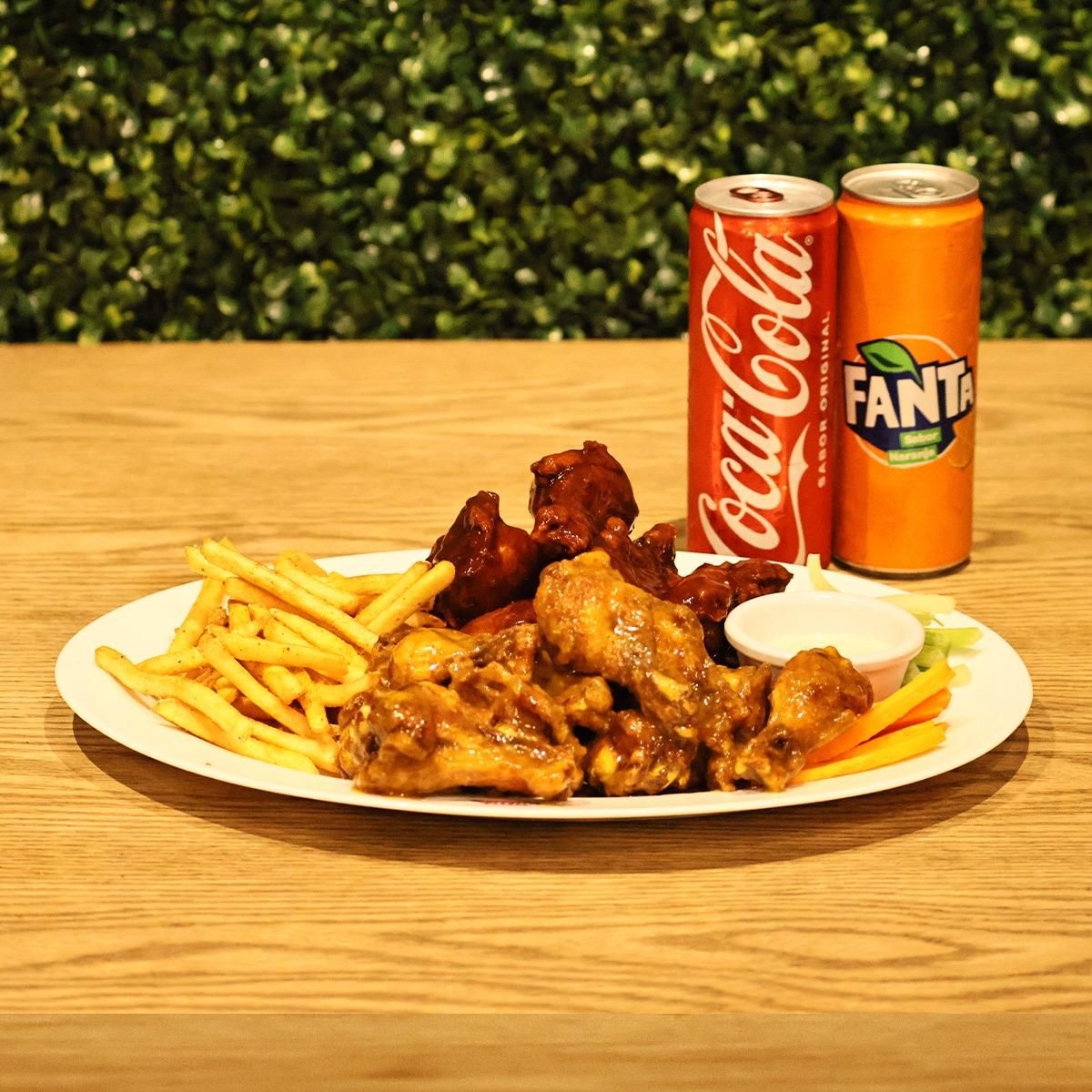 20 pzas de alitas o 500 grs de boneles, 300 g papas a la francesa, 15 crudités pepino y zanahoria, 2 refrescos 355 ml, platillo a elegir