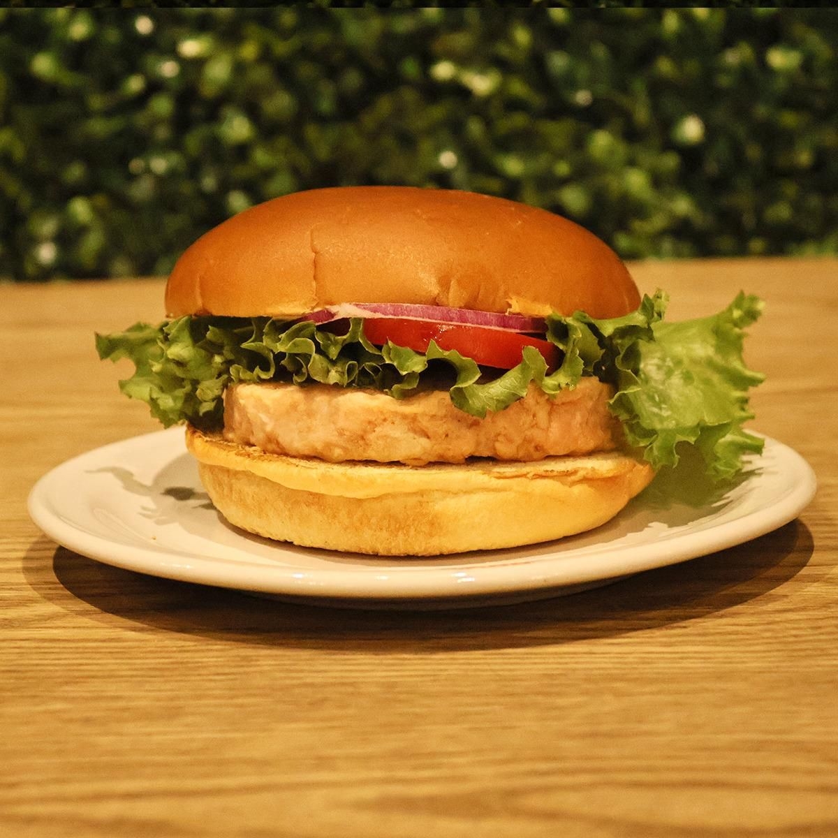 Riquísima hamburguesa de salmón con salsa pesto, jitomate, cebolla, mayonesa y aderezo balsámico.