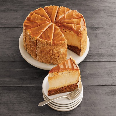 Nuestro Cremoso Cheesecake de Calabaza horneado en una Base de Galleta Graham y espolvoreada con Nueces Picadas.