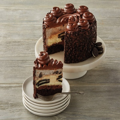 Cremoso cheesecake en capas con galletas OREO®, cubierto con mousse de galletas OREO® y betún de chocolate.