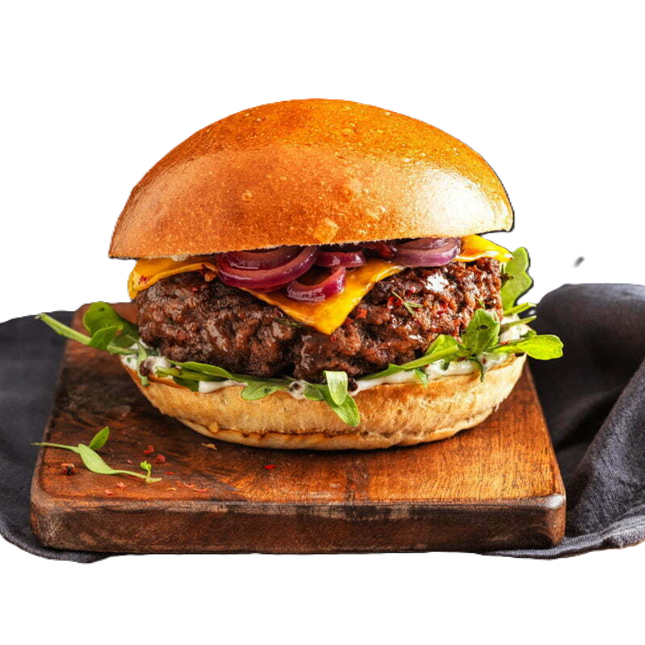 Pan brioche, carne de res, queso americano, tocino, mix de vegetales, aderezos (mayonesa, mostaza y cátsup) Jalapeño picado, cebolla y jitomate.