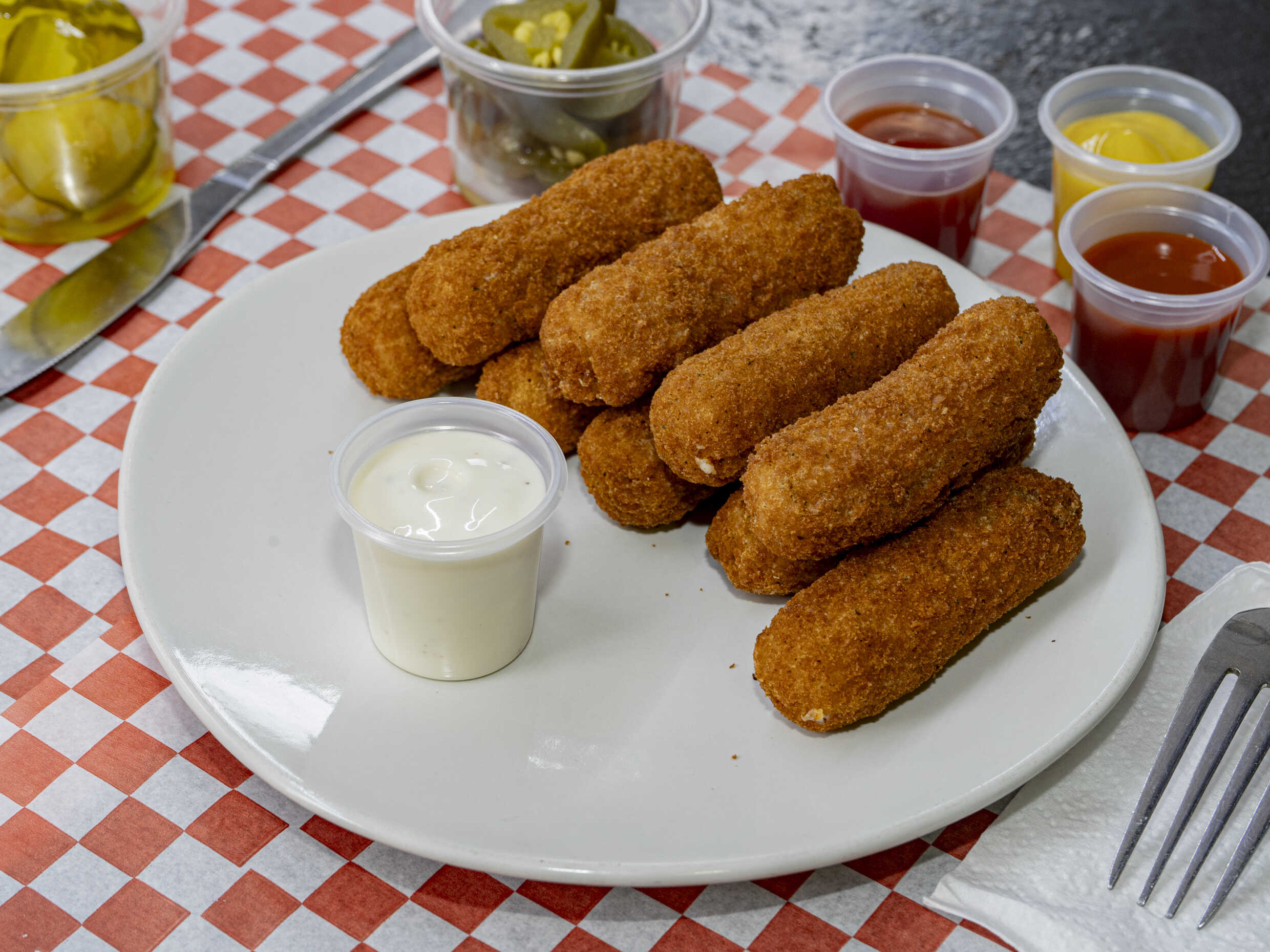 Tiritas de queso mozzarella empanizadas (8pzs), acompañadas de aderezo blue cheese