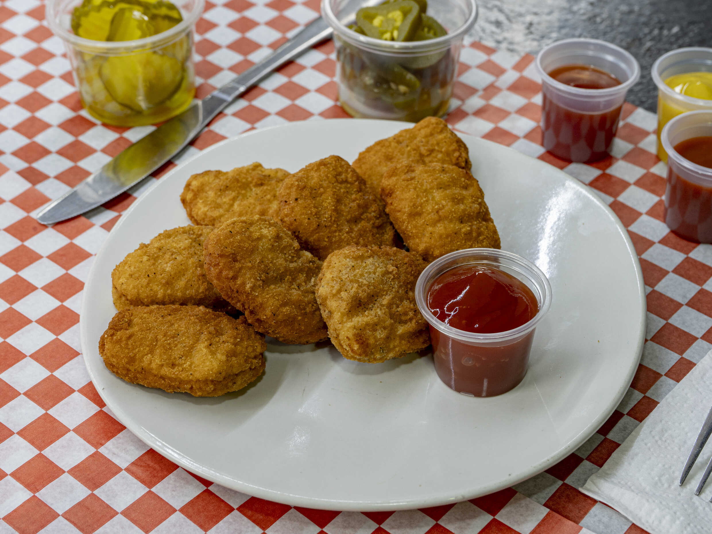 Pechuga empanizada (100g), costra de queso, aderezo ranch.