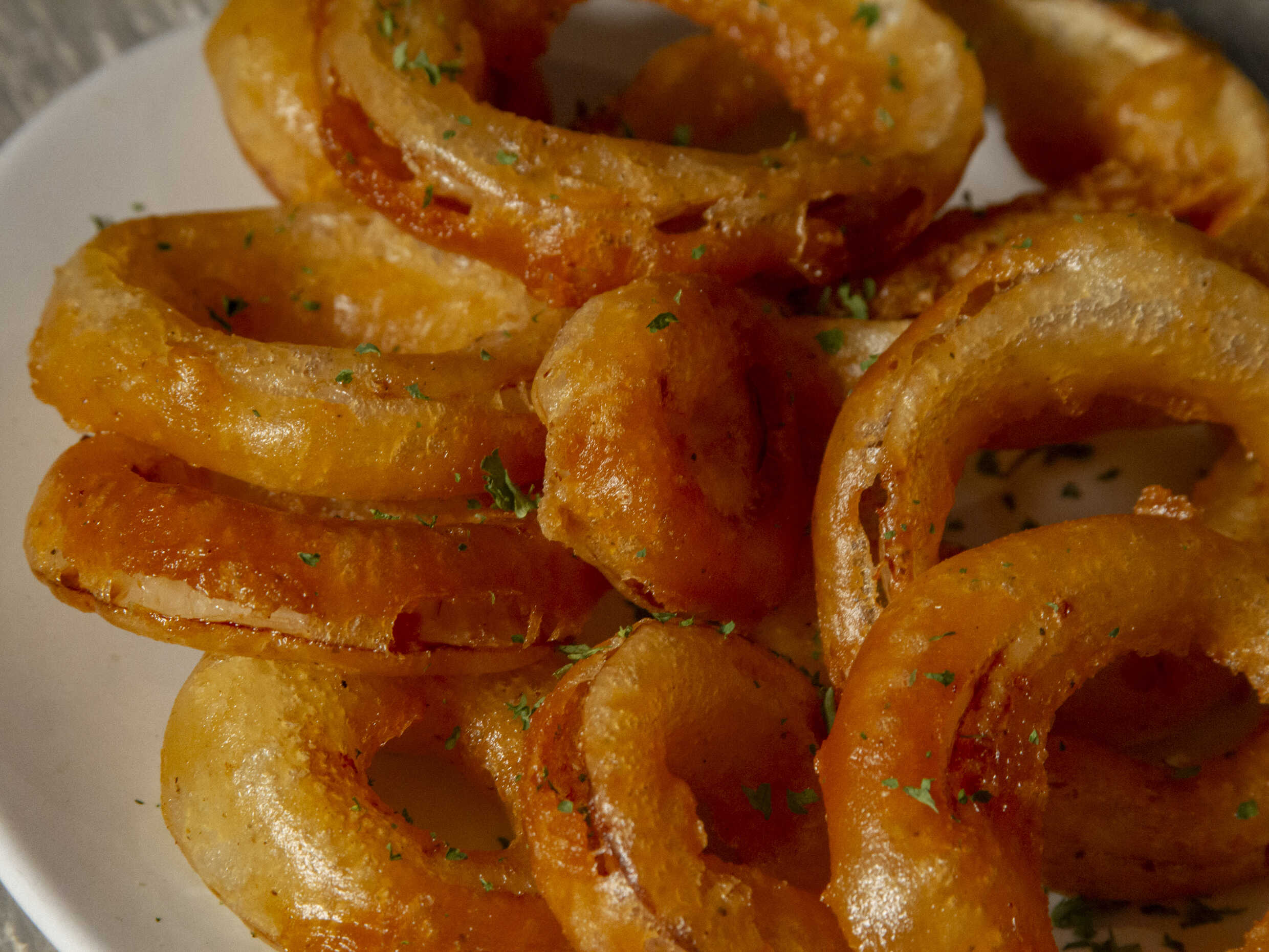 Aros de cebolla capeados (16pzs), acompañados de aderezo de frambuesa.