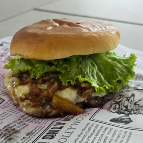 Top sirloin (100gr), costra de queso, queso cheddar, mermelada de tocino, salsa BBQ